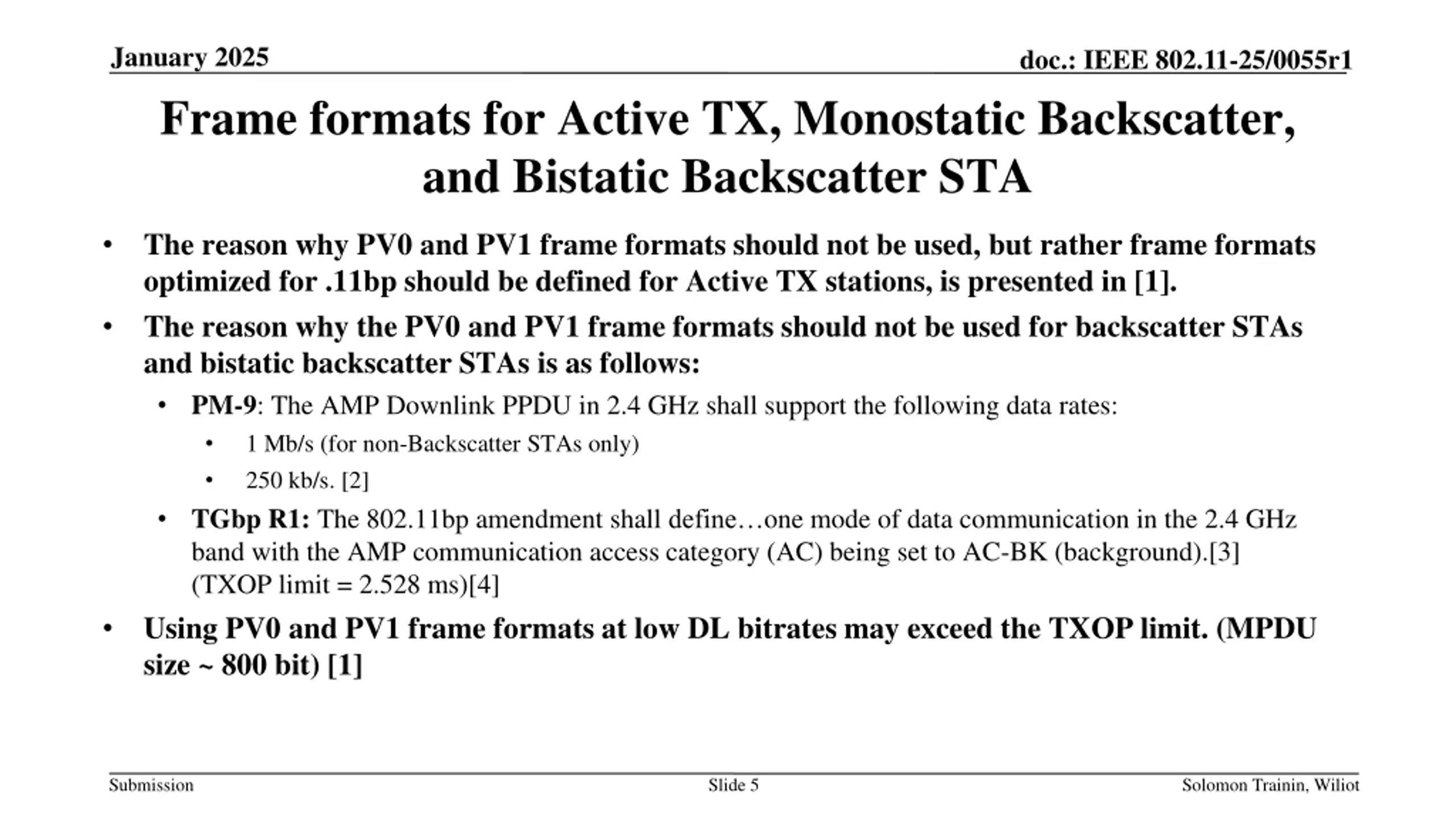 January 2025 doc.: IEEE 802.11-25/0055r1 Frame formats for Active TX, Monostatic Backscatter, and Bistatic Backscatter STA The reason why PV0 and PV1 frame formats should not be used, but rather frame formats optimized for .11bp should be defined for Active TX stations, is presented in [1]. The reason why the PV0 and PV1 frame formats should not be used for backscatter STAs and bistatic backscatter STAs is as follows: PM-9: The AMP Downlink PPDU in 2.4 GHz shall support the following data rates: 1 Mb/s (for non-Backscatter STAs only) 250 kb/s. [2] TGbp R1: The 802.11bp amendment shall define one mode of data communication in the 2.4 GHz band with the AMP communication access category (AC) being set to AC-BK (background).[3] (TXOP limit = 2.528 ms)[4] Using PV0 and PV1 frame formats at low DL bitrates may exceed the TXOP limit. (MPDU size ~ 800 bit) [1] Submission Slide 5 Solomon Trainin, Wiliot