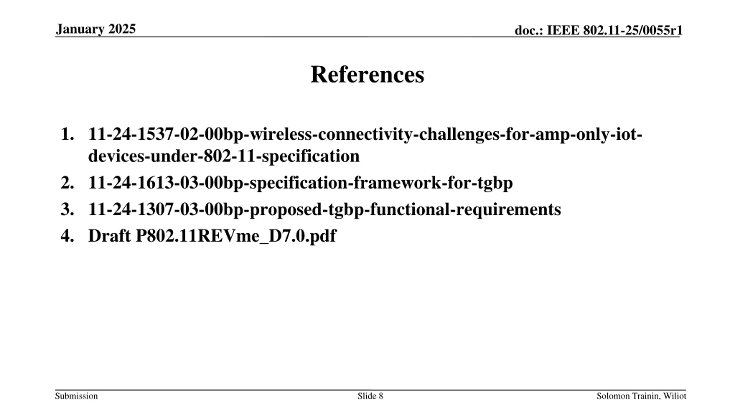 January 2025 doc.: IEEE 802.11-25/0055r1 References 1. 11-24-1537-02-00bp-wireless-connectivity-challenges-for-amp-only-iot- devices-under-802-11-specification 2. 11-24-1613-03-00bp-specification-framework-for-tgbp 3. 11-24-1307-03-00bp-proposed-tgbp-functional-requirements 4. Draft P802.11REVme_D7.0.pdf Submission Slide 8 Solomon Trainin, Wiliot