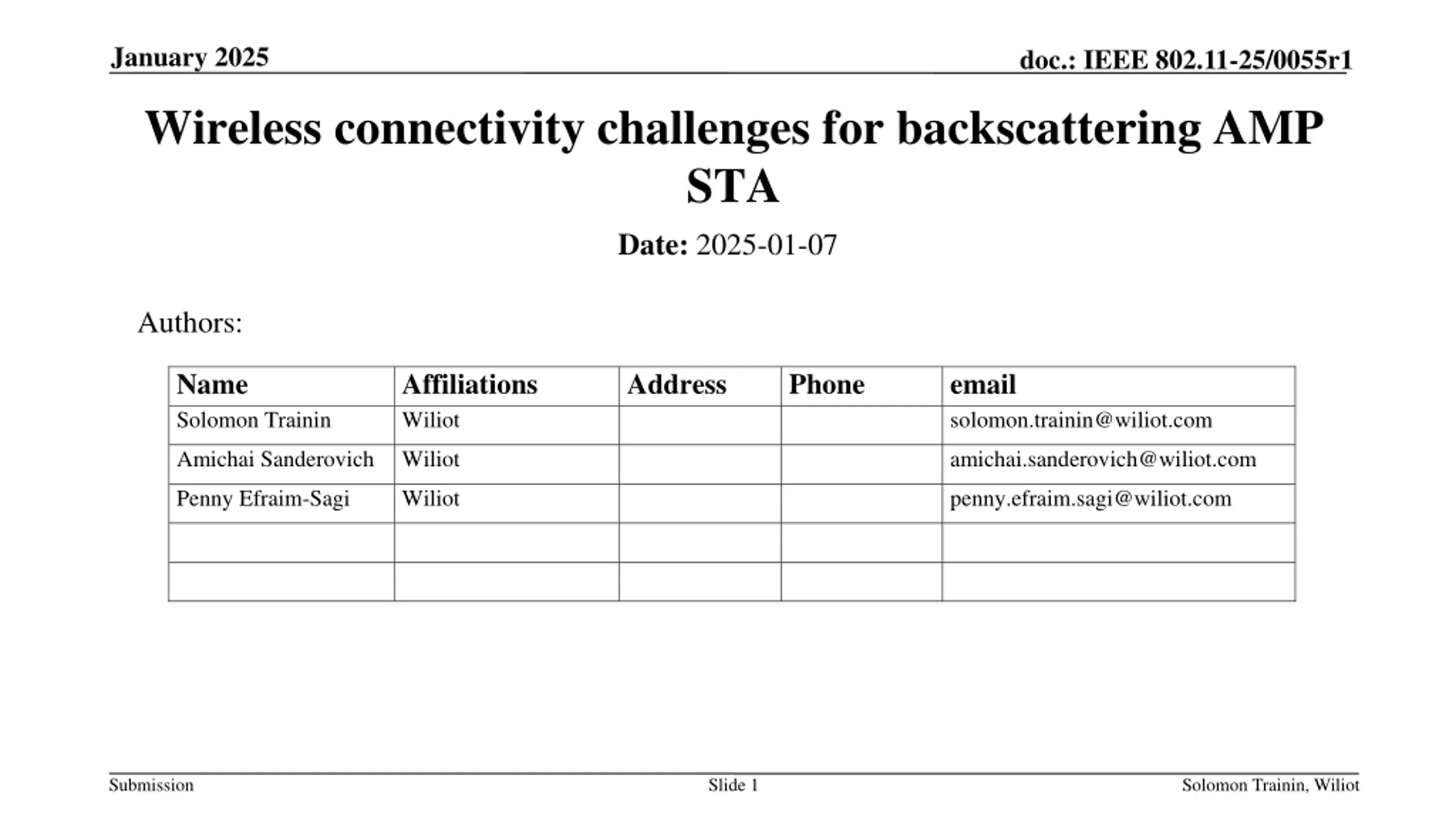 January 2025 doc.: IEEE 802.11-25/0055r1 Wireless connectivity challenges for backscattering AMP STA Date: 2025-01-07 Authors: Name Solomon Trainin Affiliations Wiliot Address Phone email solomon.trainin@wiliot.com Amichai Sanderovich Wiliot amichai.sanderovich@wiliot.com Penny Efraim-Sagi Wiliot penny.efraim.sagi@wiliot.com Submission Slide 1 Solomon Trainin, Wiliot