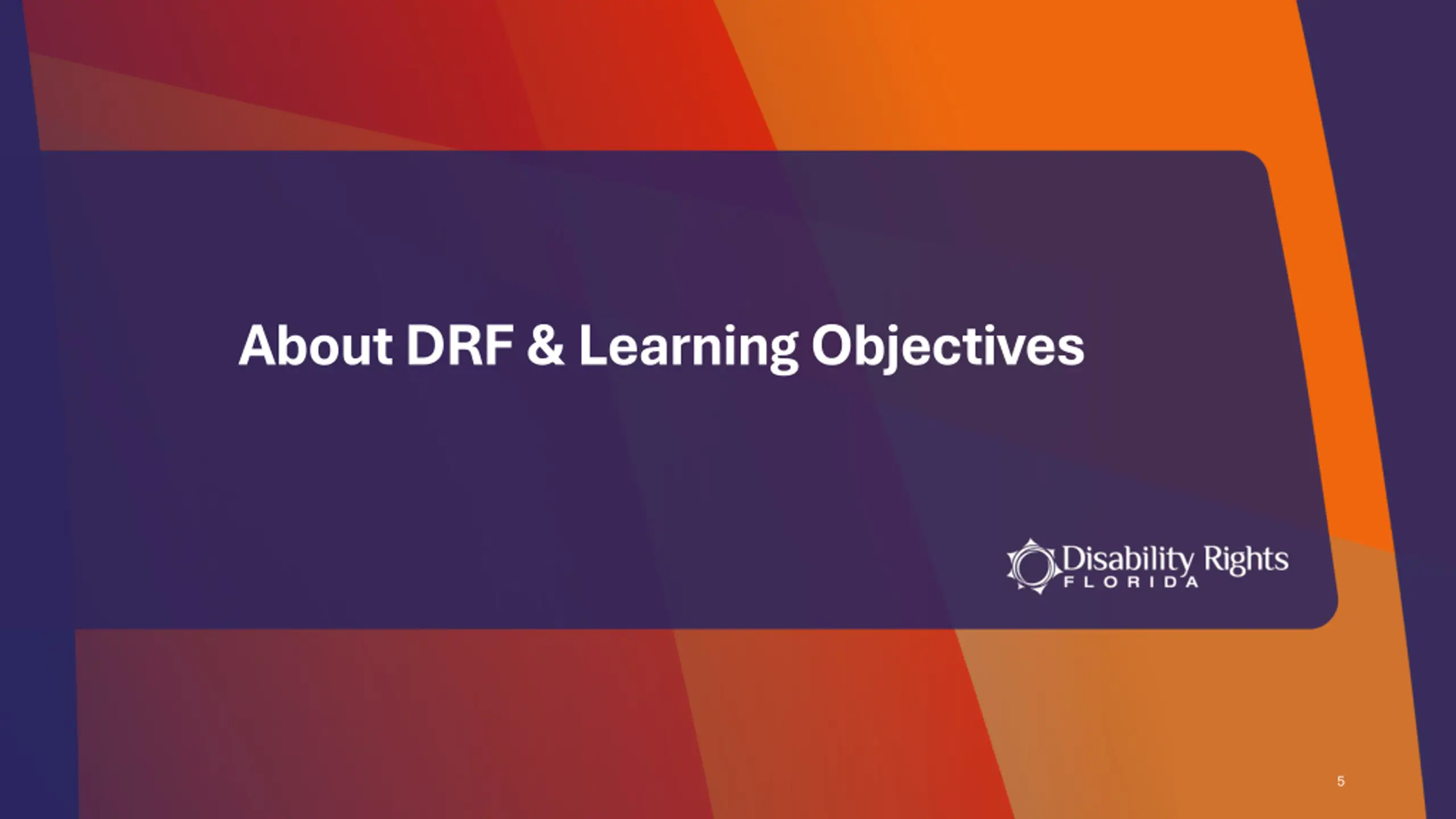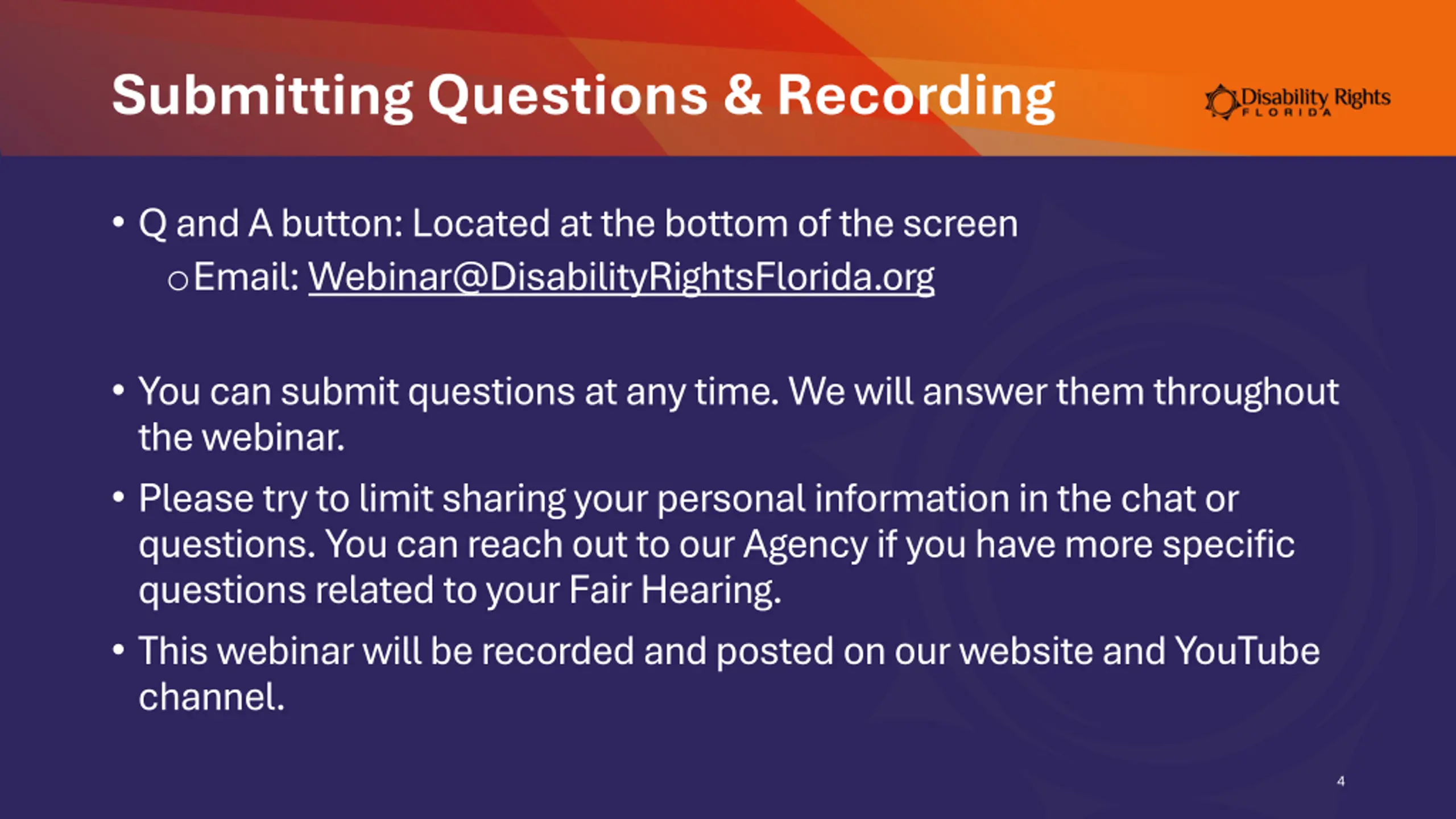 Submitting Questions & Recording Q and A button: Located at the bottom of the screen oEmail: Webinar@DisabilityRightsFlorida.org You can submit questions at any time. We will answer them throughout the webinar. Please try to limit sharing your personal information in the chat or questions. You can reach out to our Agency if you have more specific questions related to your Fair Hearing. This webinar will be recorded and posted on our website and YouTube channel. 4