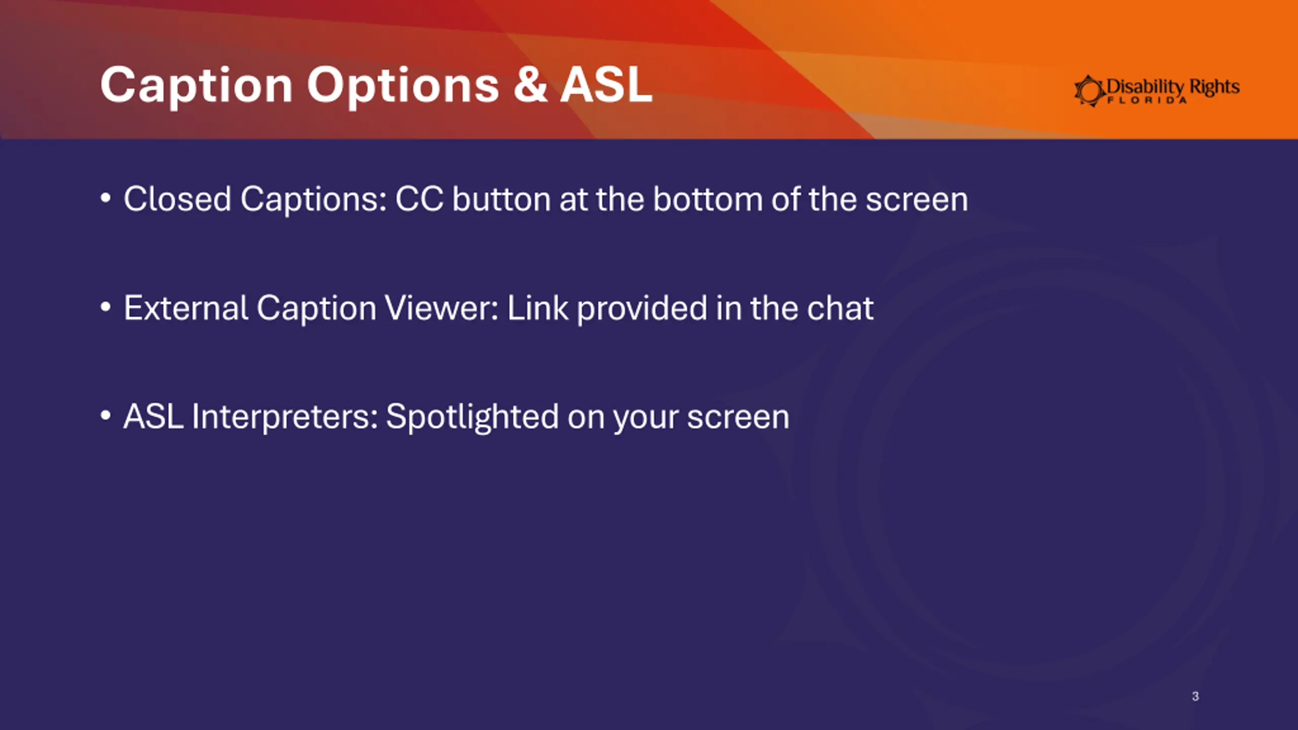 Caption Options & ASL Closed Captions: CC button at the bottom of the screen External Caption Viewer: Link provided in the chat ASL Interpreters: Spotlighted on your screen 3