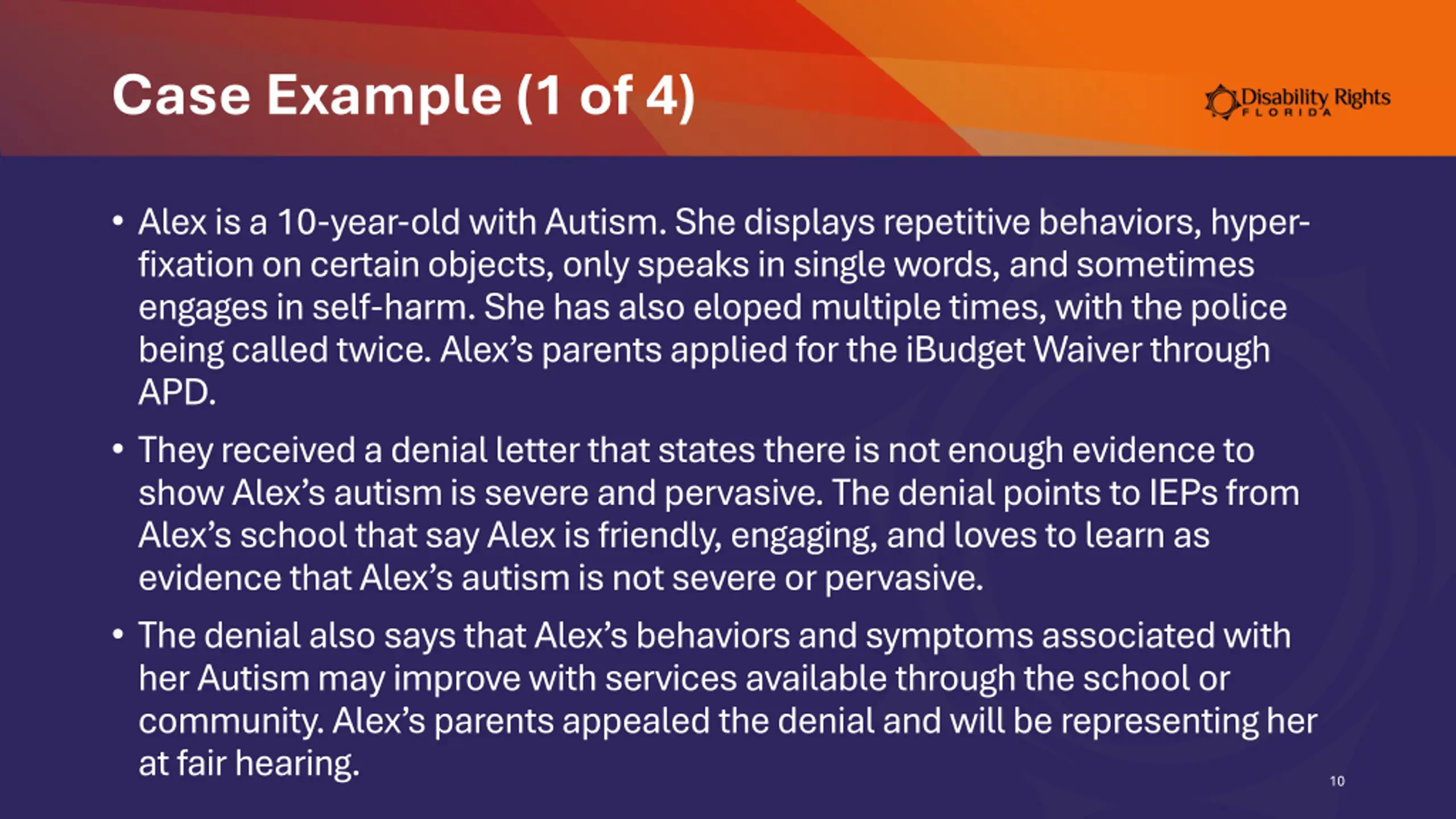 Case Example (1 of 4) Alex is a 10-year-old with Autism. She displays repetitive behaviors, hyper- fixation on certain objects, only speaks in single words, and sometimes engages in self-harm. She has also eloped multiple times, with the police being called twice. Alex s parents applied for the iBudget Waiver through APD. They received a denial letter that states there is not enough evidence to show Alex s autism is severe and pervasive. The denial points to IEPs from Alex s school that say Alex is friendly, engaging, and loves to learn as evidence that Alex s autism is not severe or pervasive. The denial also says that Alex s behaviors and symptoms associated with her Autism may improve with services available through the school or community. Alex s parents appealed the denial and will be representing her at fair hearing. 10