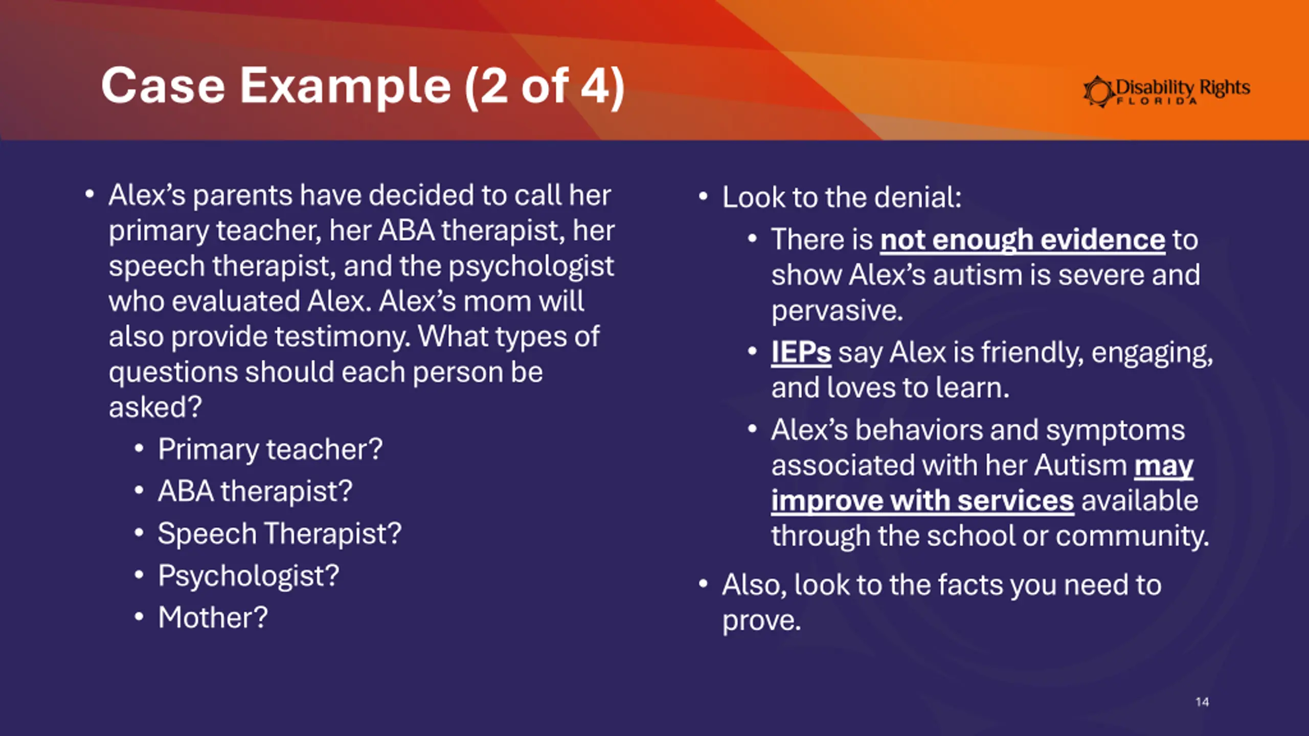 Case Example (2 of 4) Alex s parents have decided to call her primary teacher, her ABA therapist, her speech therapist, and the psychologist who evaluated Alex. Alex s mom will also provide testimony. What types of questions should each person be asked? Primary teacher? ABA therapist? Speech Therapist? Psychologist? Mother? Look to the denial: There is not enough evidence to show Alex s autism is severe and pervasive. IEPs say Alex is friendly, engaging, and loves to learn. Alex s behaviors and symptoms associated with her Autism may improve with services available through the school or community. Also, look to the facts you need to prove. 14