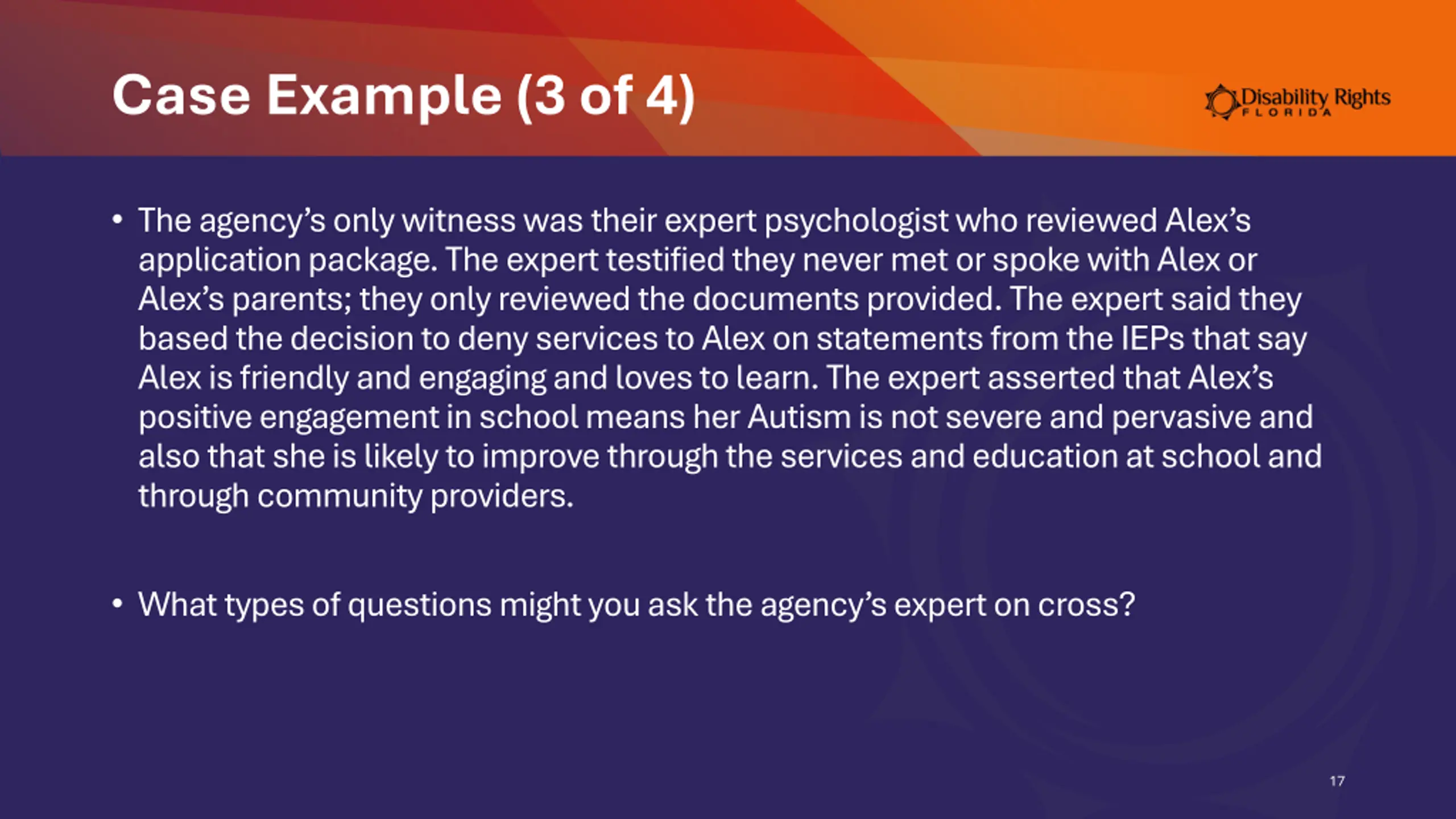 Case Example (3 of 4) The agency s only witness was their expert psychologist who reviewed Alex s application package. The expert testified they never met or spoke with Alex or Alex s parents; they only reviewed the documents provided. The expert said they based the decision to deny services to Alex on statements from the IEPs that say Alex is friendly and engaging and loves to learn. The expert asserted that Alex s positive engagement in school means her Autism is not severe and pervasive and also that she is likely to improve through the services and education at school and through community providers. What types of questions might you ask the agency s expert on cross? 17