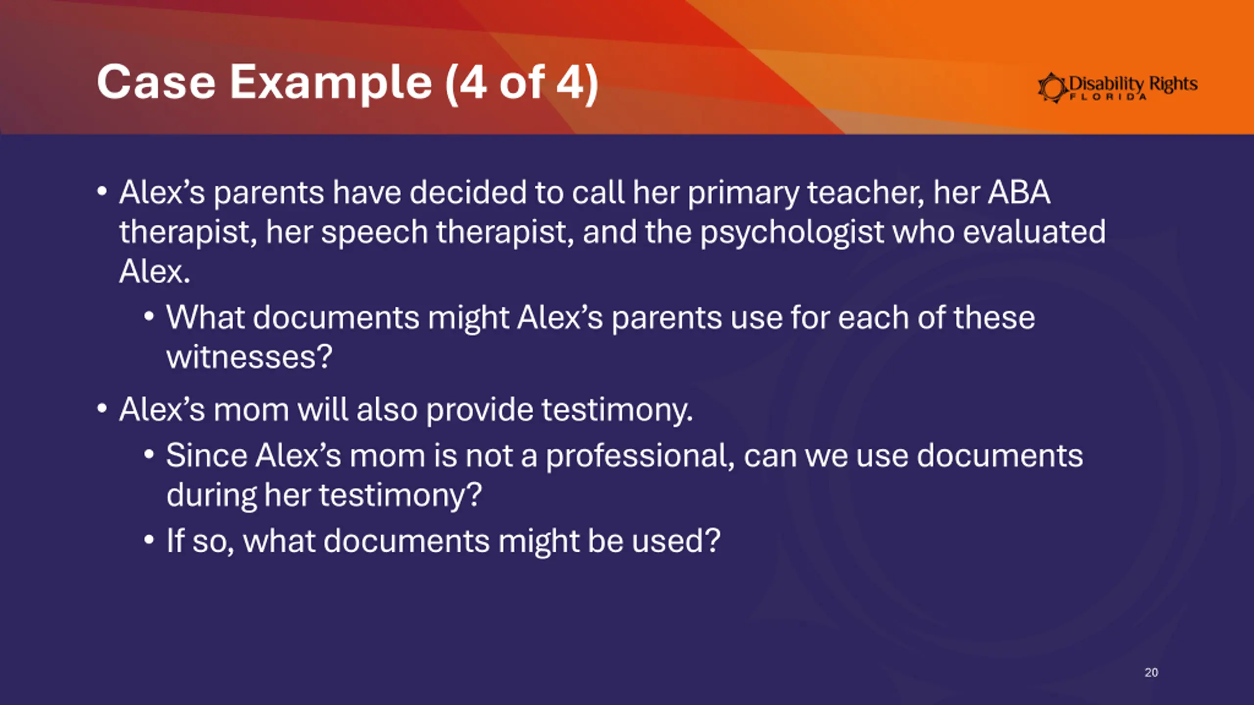 Case Example (4 of 4) Alex s parents have decided to call her primary teacher, her ABA therapist, her speech therapist, and the psychologist who evaluated Alex. What documents might Alex s parents use for each of these witnesses? Alex s mom will also provide testimony. Since Alex s mom is not a professional, can we use documents during her testimony? If so, what documents might be used? 20