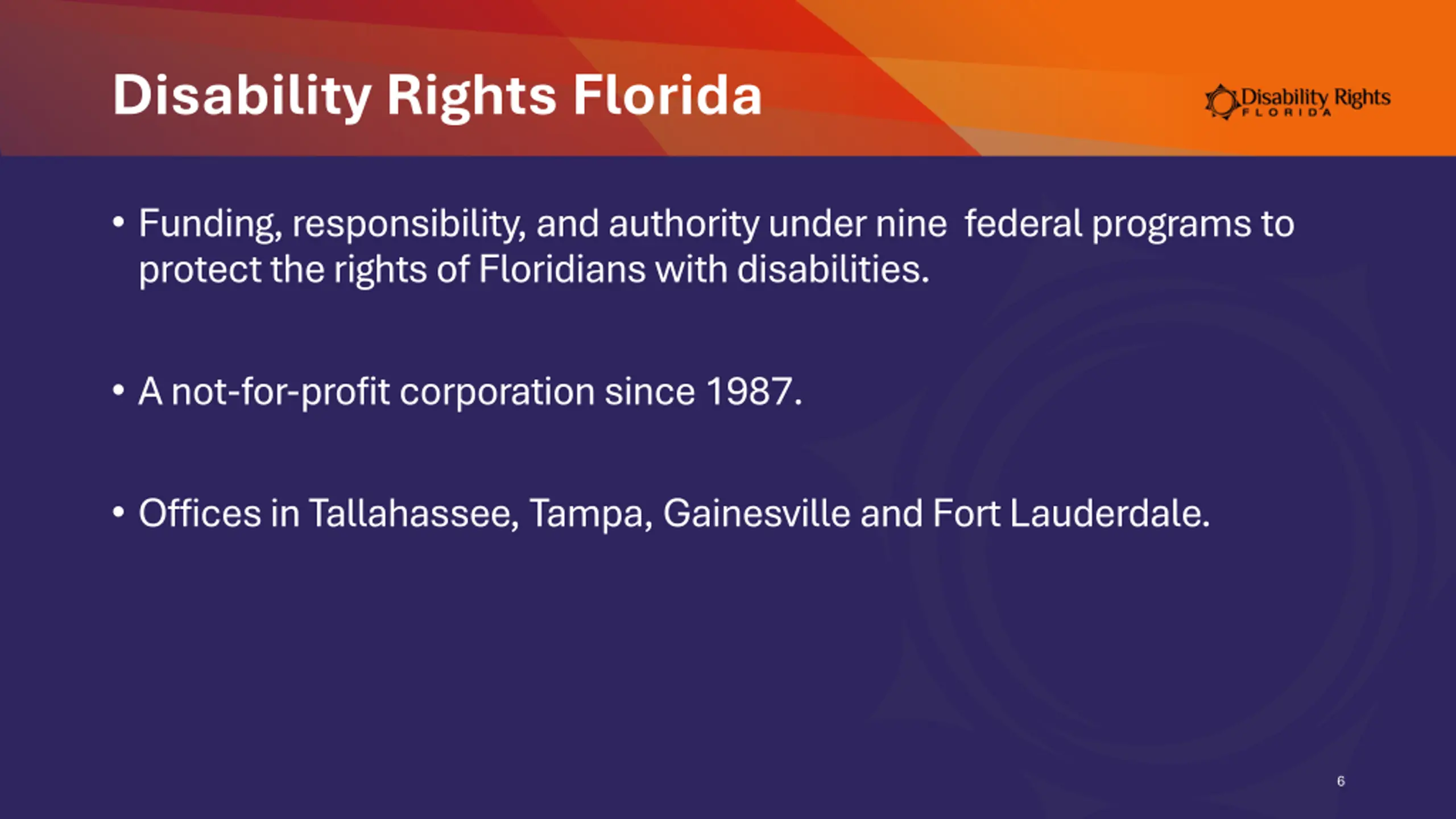 Disability Rights Florida Funding, responsibility, and authority under nine federal programs to protect the rights of Floridians with disabilities. A not-for-profit corporation since 1987. Offices in Tallahassee, Tampa, Gainesville and Fort Lauderdale. 6