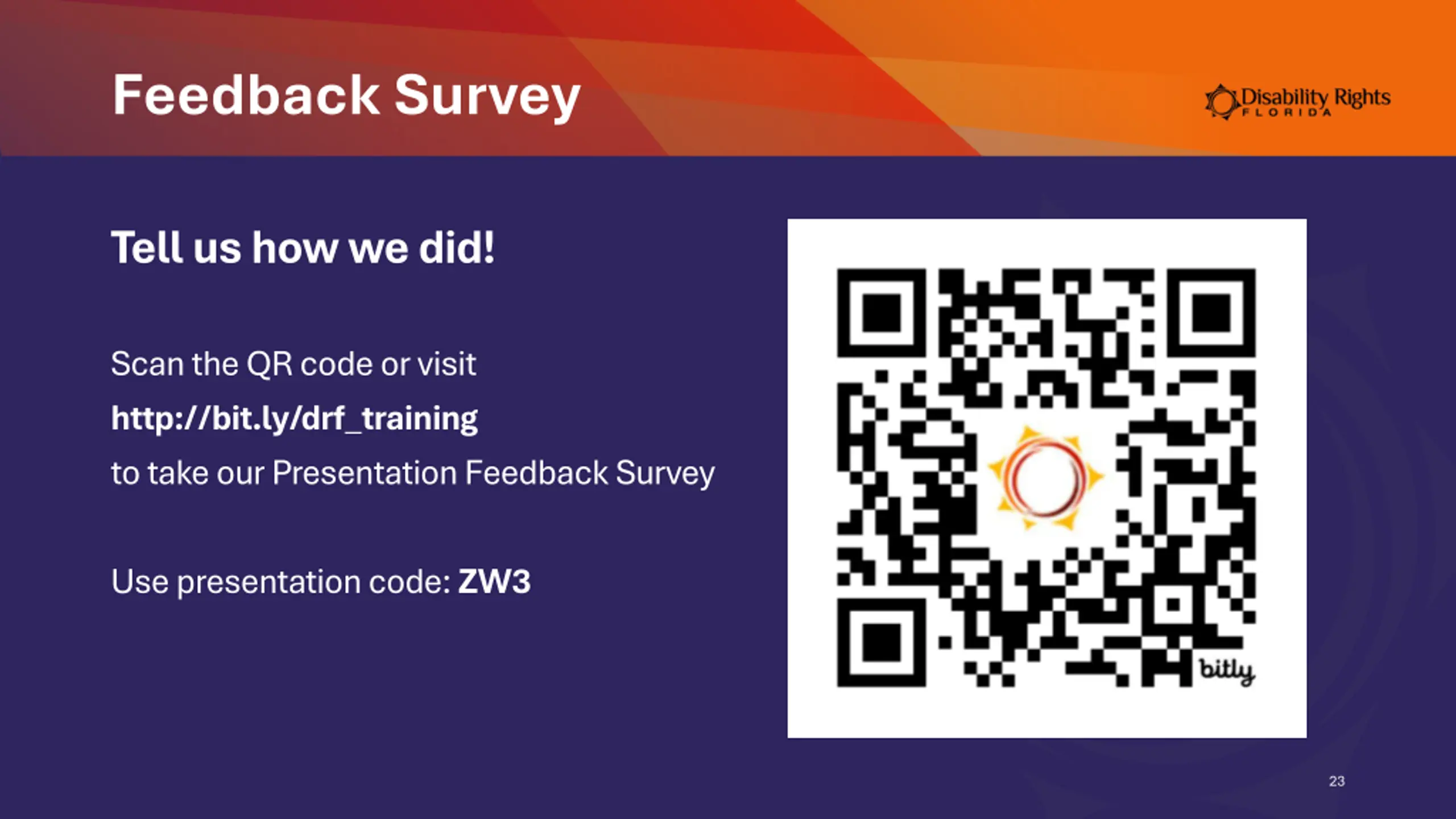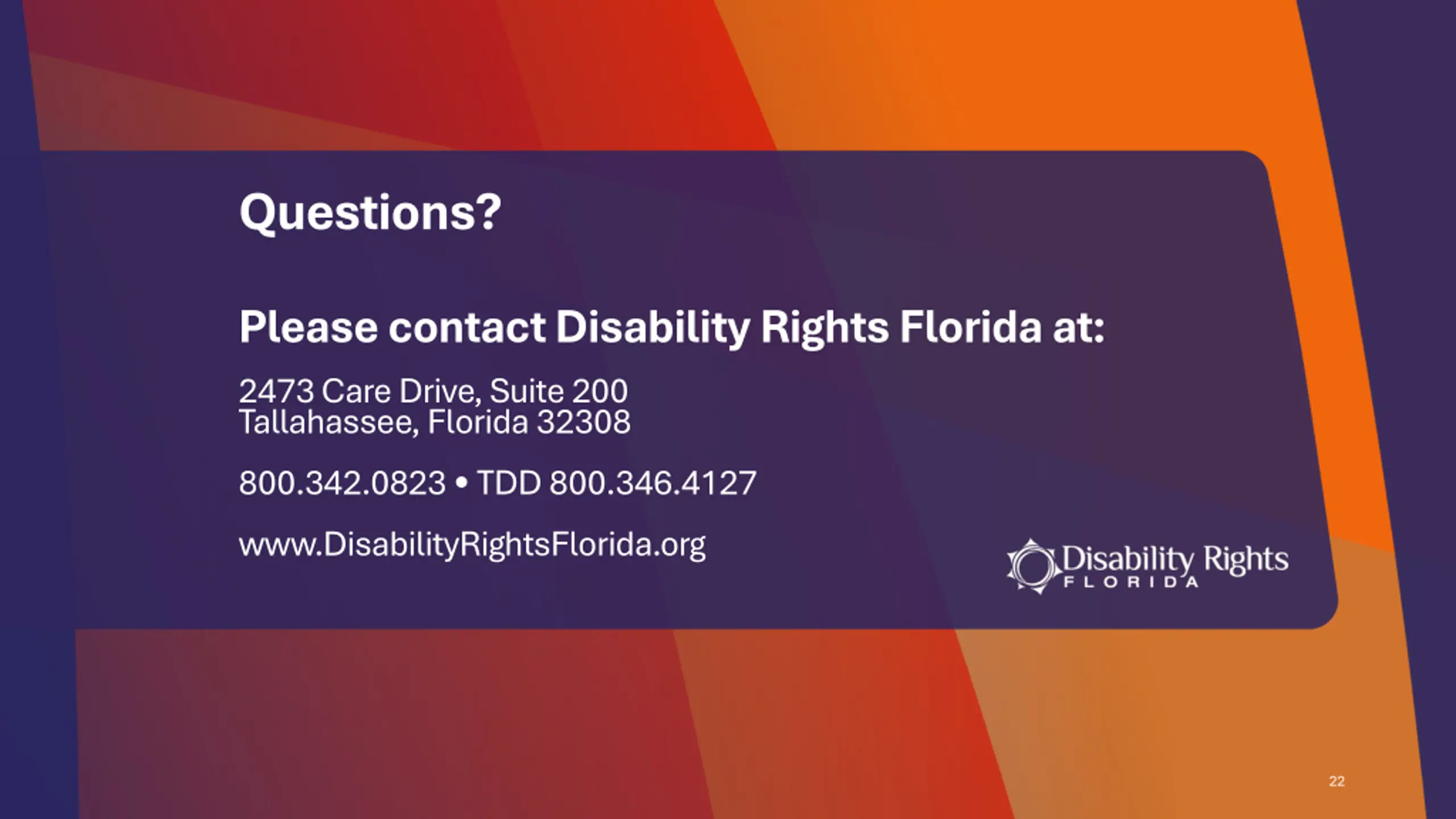 Questions? Please contact Disability Rights Florida at: 2473 Care Drive, Suite 200 Tallahassee, Florida 32308 800.342.0823 TDD 800.346.4127 www.DisabilityRightsFlorida.org 22