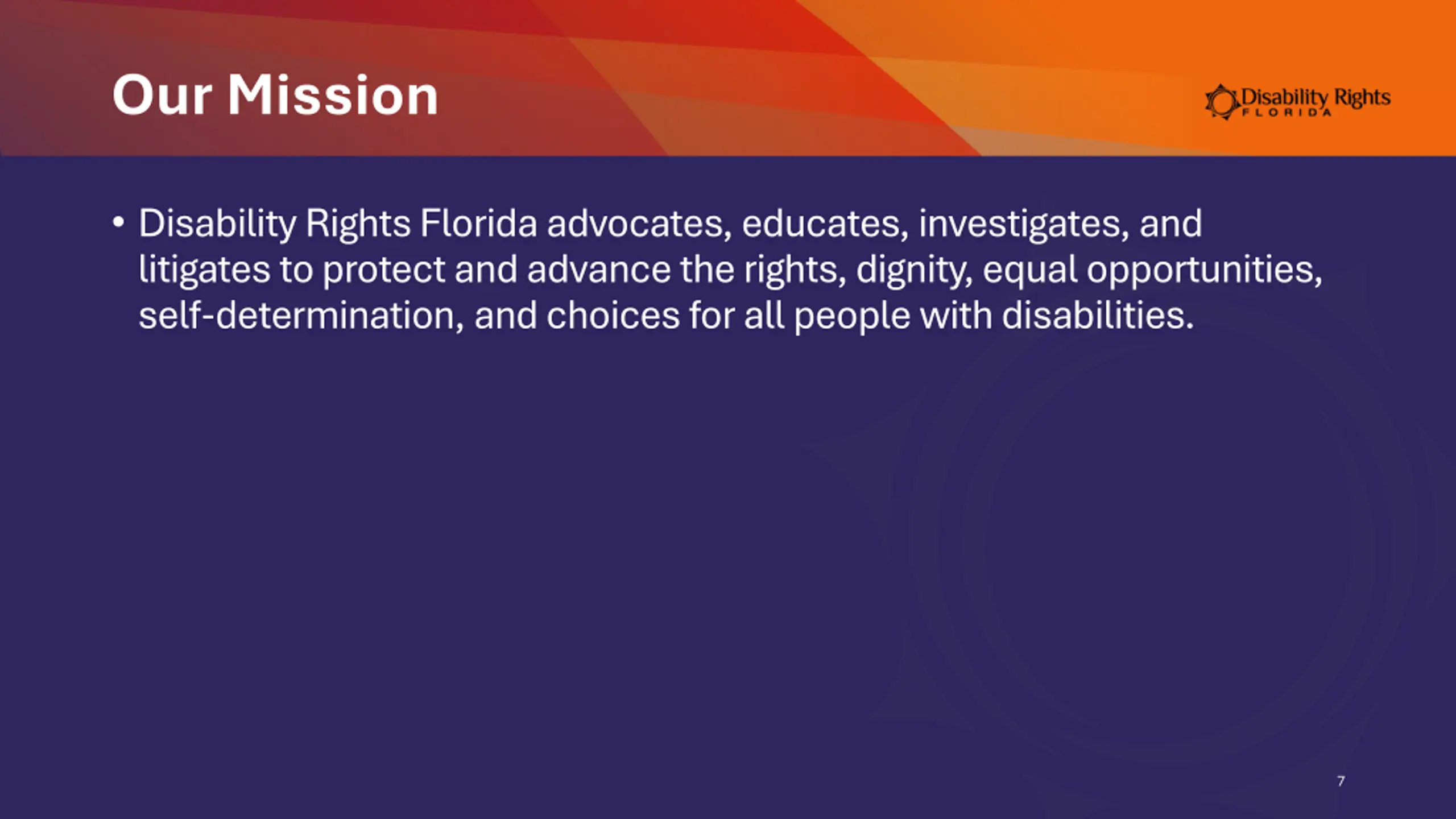Our Mission Disability Rights Florida advocates, educates, investigates, and litigates to protect and advance the rights, dignity, equal opportunities, self-determination, and choices for all people with disabilities. 7