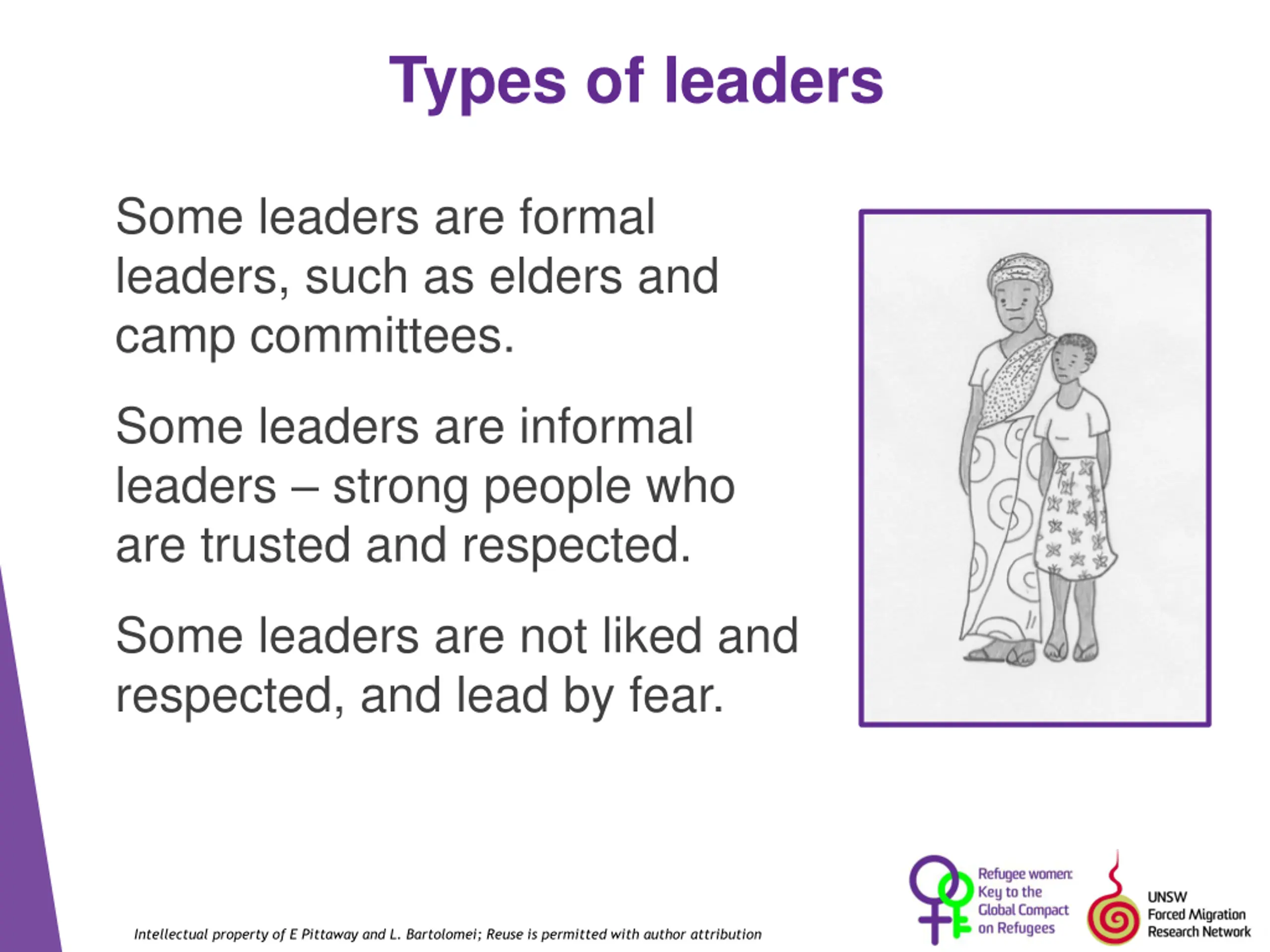 Types of leaders Some leaders are formal leaders, such as elders and camp committees. Some leaders are informal leaders strong people who are trusted and respected. Some leaders are not liked and respected, and lead by fear. Intellectual property of E Pittaway and L. Bartolomei; Reuse is permitted with author attribution