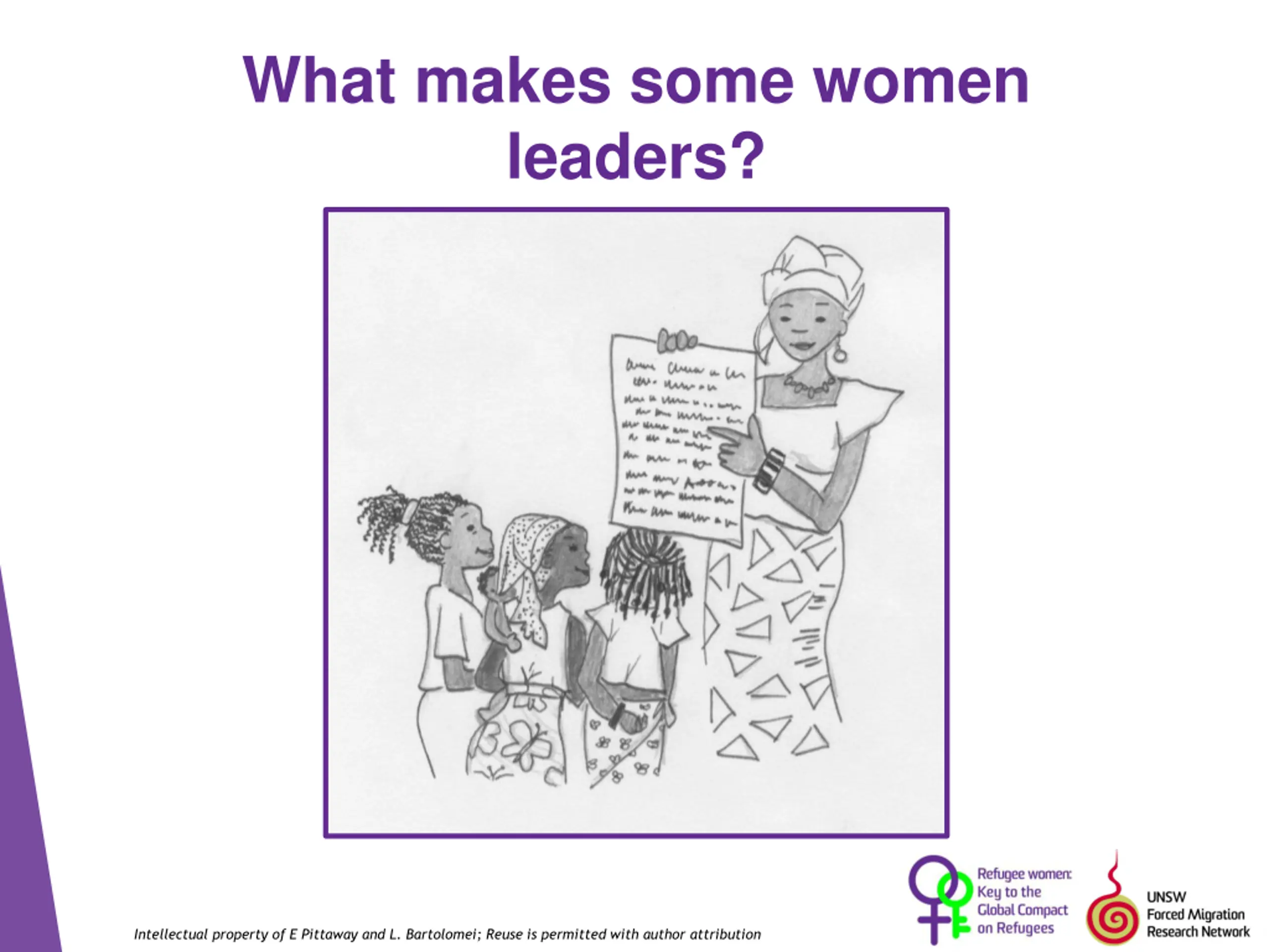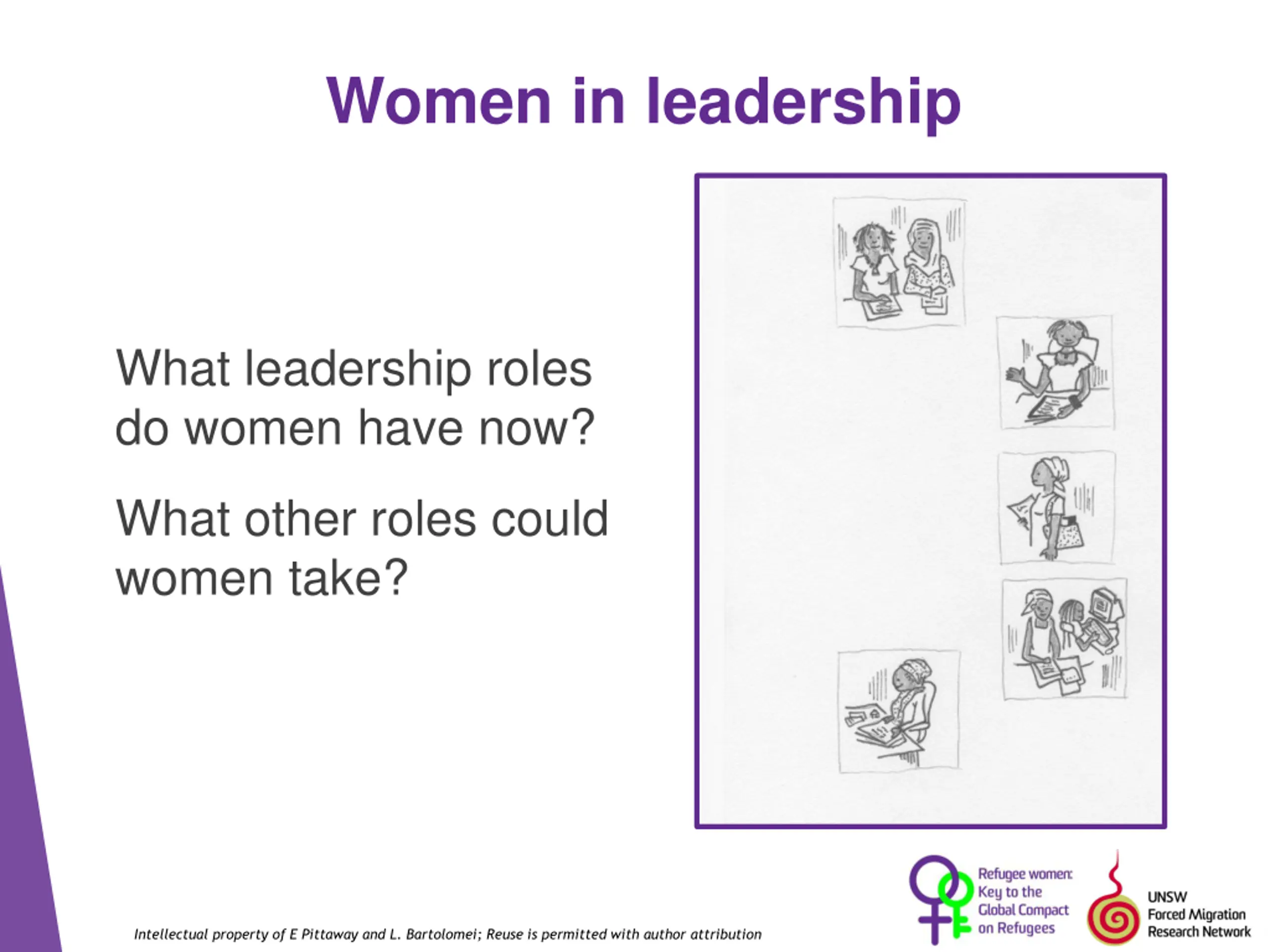 Women in leadership What support and resources would help women in their work as community leaders? What training do women need to become leaders? Intellectual property of E Pittaway and L. Bartolomei; Reuse is permitted with author attribution