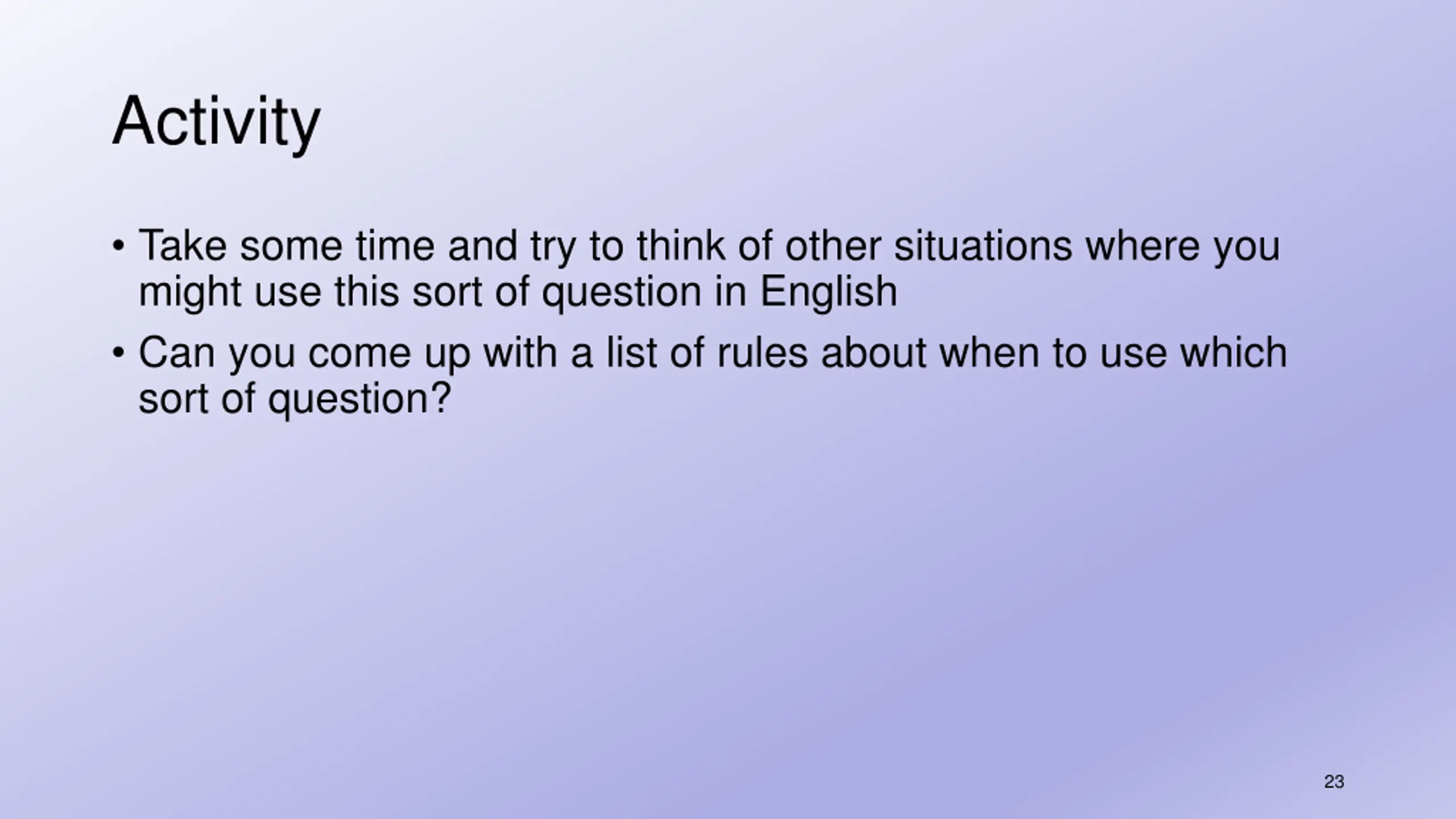 Activity Take some time and try to think of other situations where you might use this sort of question in English Can you come up with a list of rules about when to use which sort of question? 23
