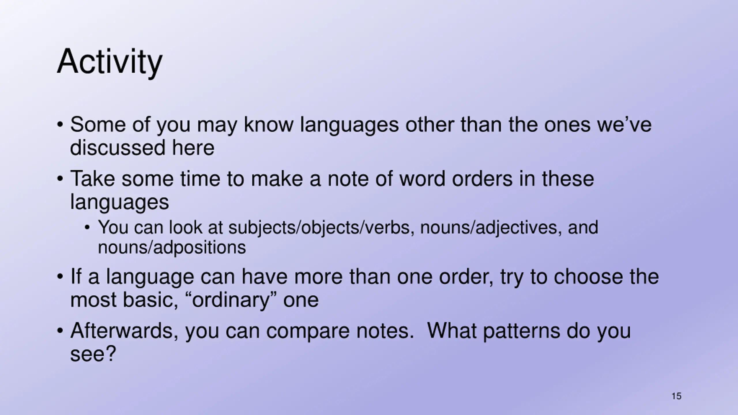Activity Some of you may know languages other than the ones we ve discussed here Take some time to make a note of word orders in these languages You can look at subjects/objects/verbs, nouns/adjectives, and nouns/adpositions If a language can have more than one order, try to choose the most basic, ordinary one Afterwards, you can compare notes. What patterns do you see? 15