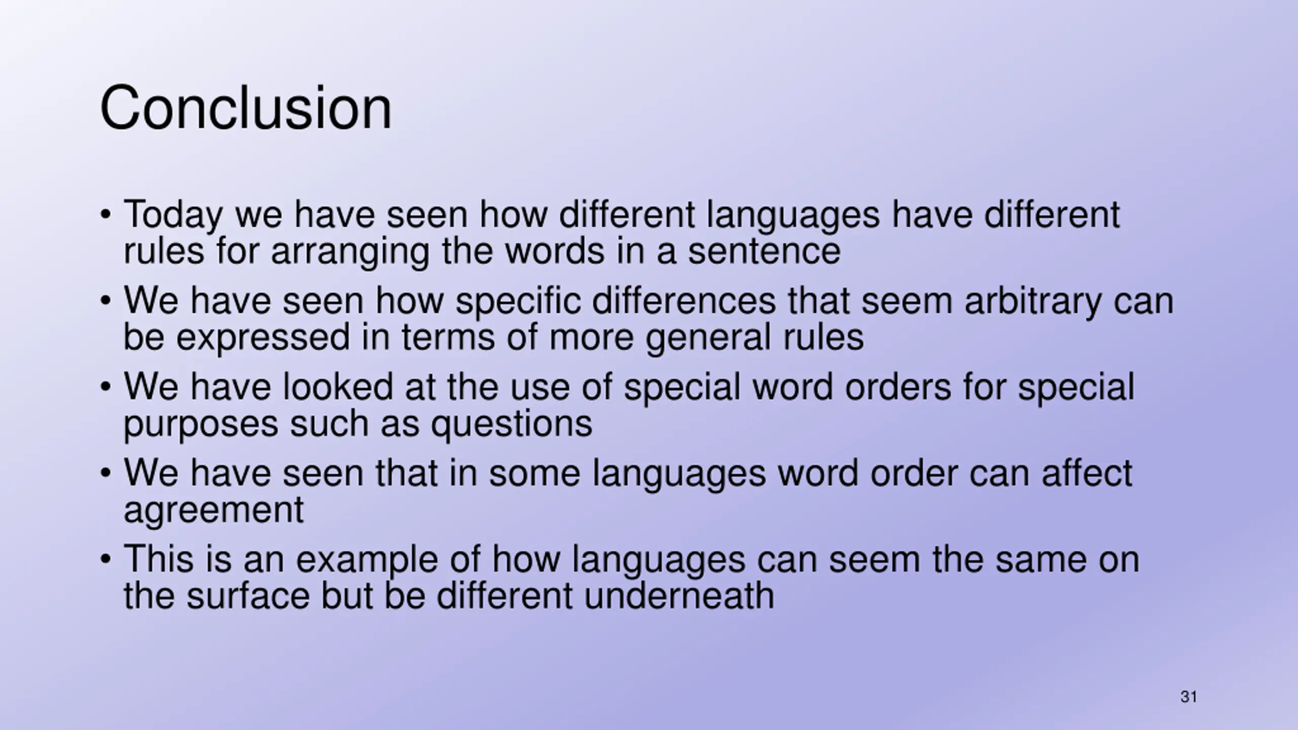 Conclusion Today we have seen how different languages have different rules for arranging the words in a sentence We have seen how specific differences that seem arbitrary can be expressed in terms of more general rules We have looked at the use of special word orders for special purposes such as questions We have seen that in some languages word order can affect agreement This is an example of how languages can seem the same on the surface but be different underneath 31