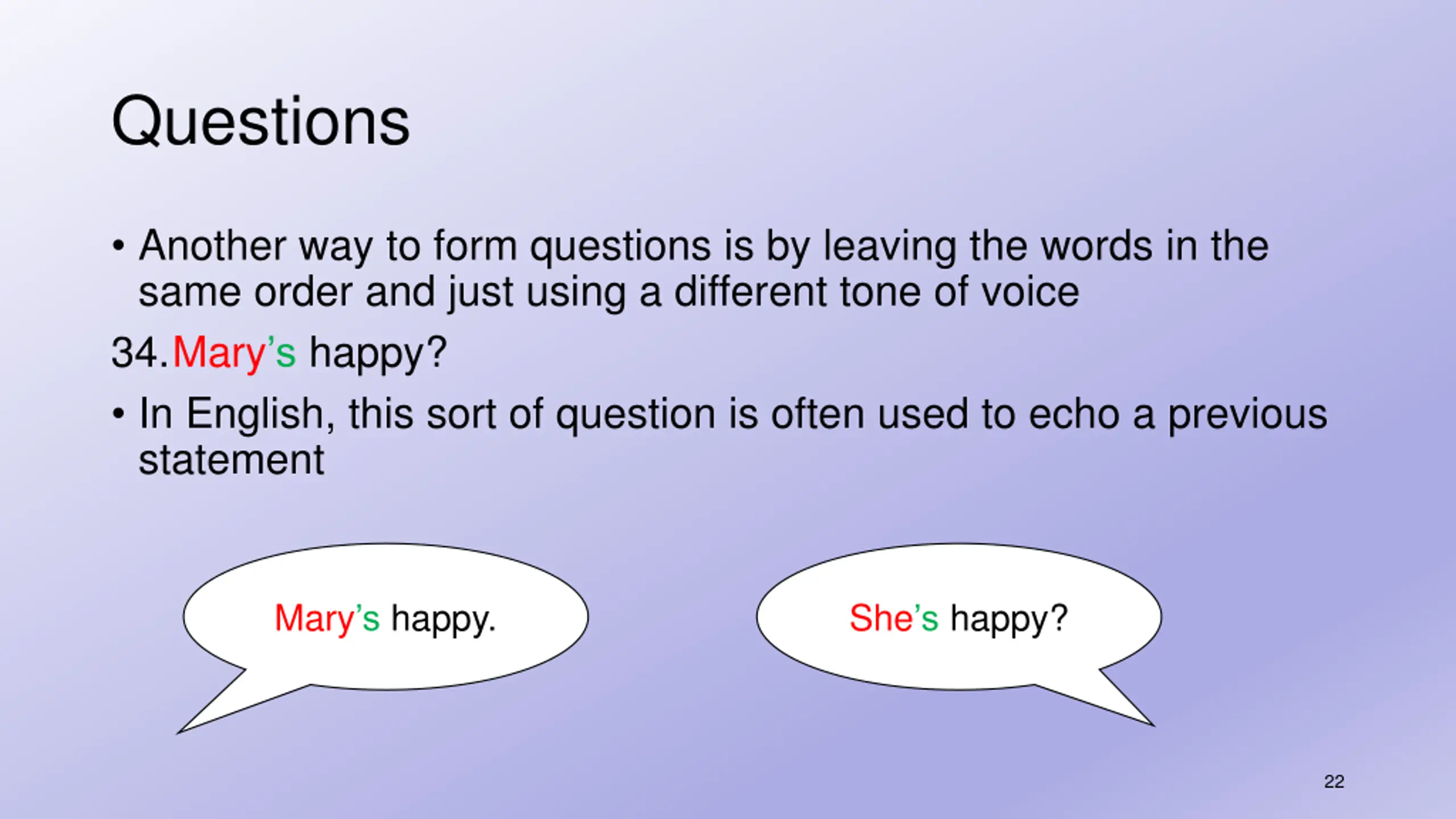 Questions Another way to form questions is by leaving the words in the same order and just using a different tone of voice 34.Mary s happy? In English, this sort of question is often used to echo a previous statement Mary s happy. She s happy? 22