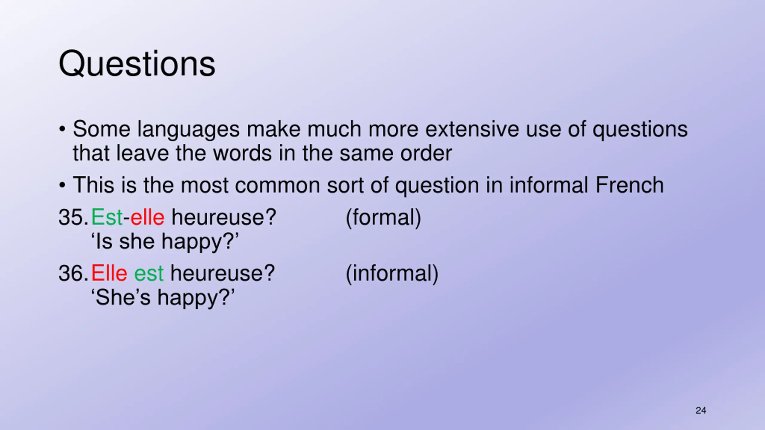 Questions Some languages make much more extensive use of questions that leave the words in the same order This is the most common sort of question in informal French 35.Est-elle heureuse? (formal) Is she happy? 36.Elle est heureuse? (informal) She s happy? 24