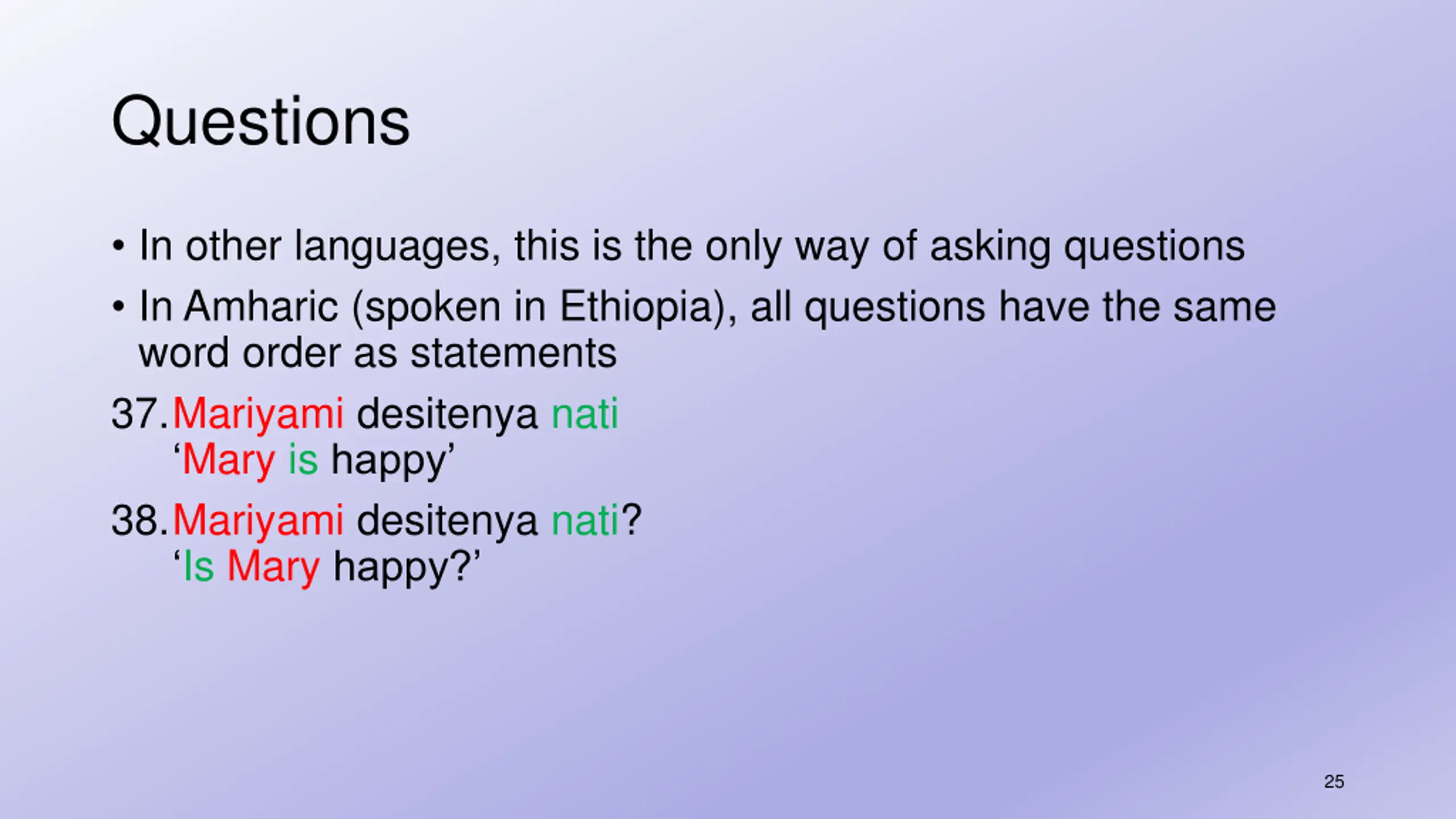 Questions In other languages, this is the only way of asking questions In Amharic (spoken in Ethiopia), all questions have the same word order as statements 37.Mariyami desitenya nati Mary is happy 38.Mariyami desitenya nati? Is Mary happy? 25