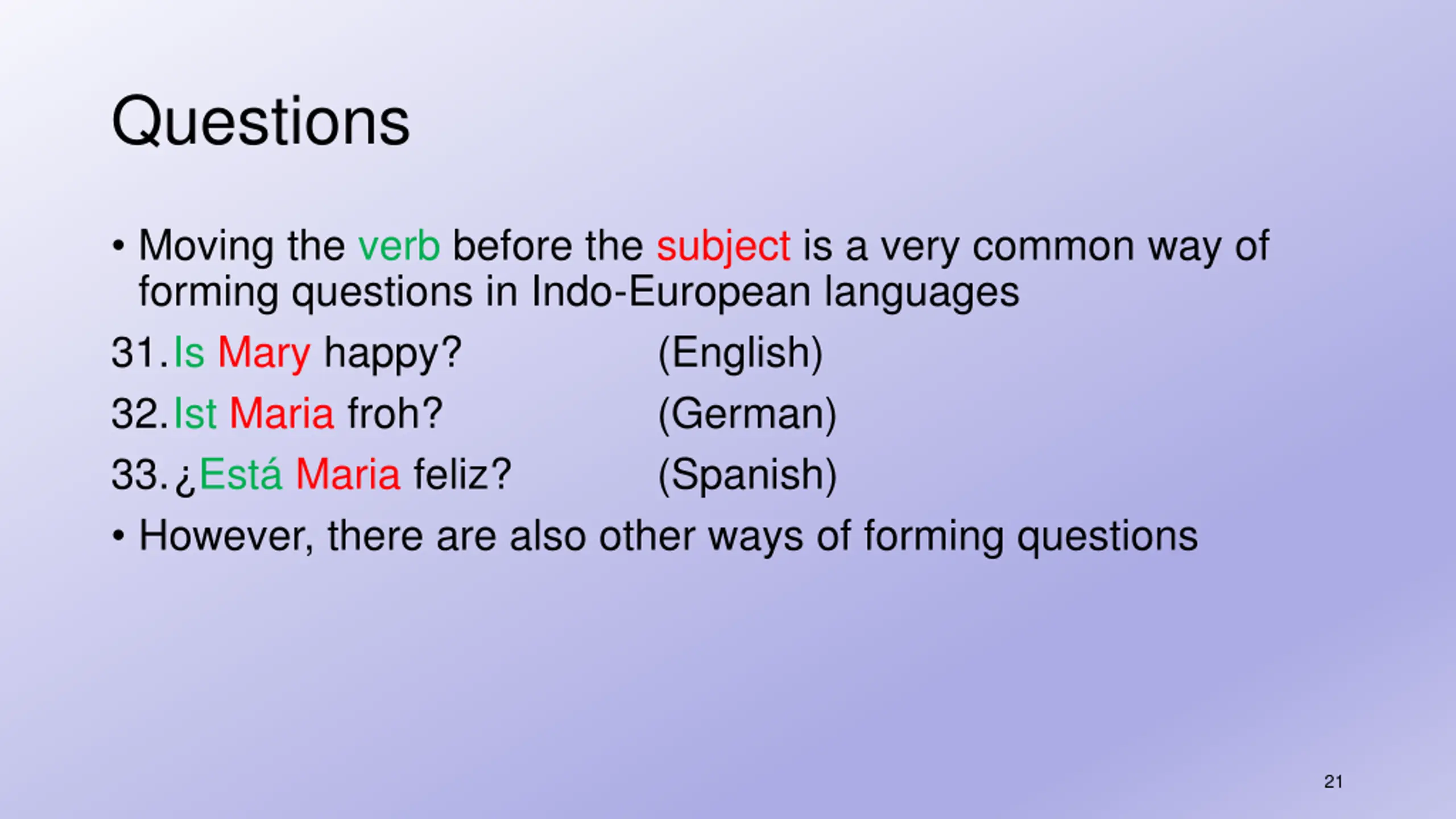 Questions Moving the verb before the subject is a very common way of forming questions in Indo-European languages 31.Is Mary happy? (English) 32.Ist Maria froh? (German) 33. Est Maria feliz? (Spanish) However, there are also other ways of forming questions 21