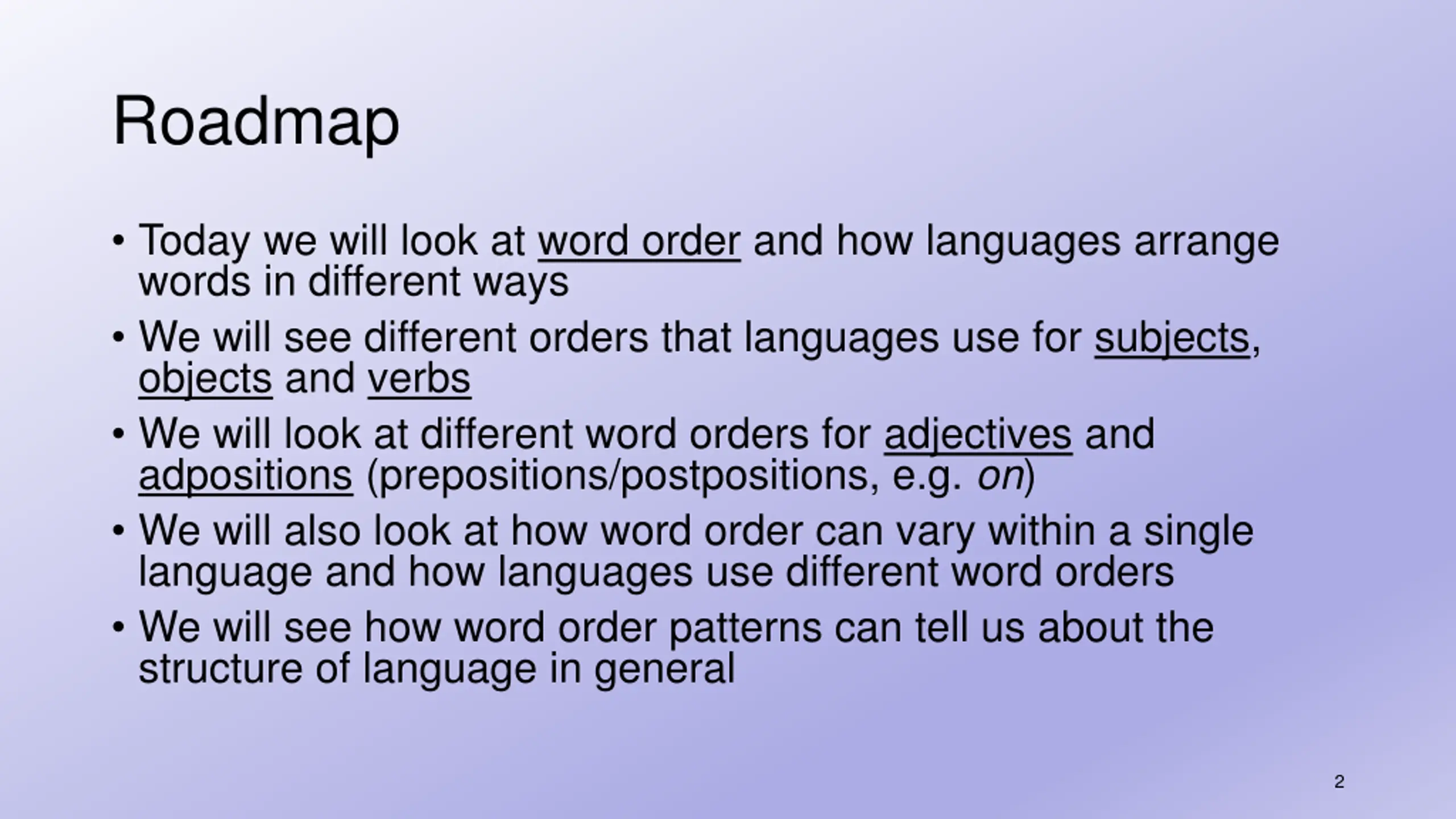 Roadmap Today we will look at word order and how languages arrange words in different ways We will see different orders that languages use for subjects, objects and verbs We will look at different word orders for adjectives and adpositions (prepositions/postpositions, e.g. on) We will also look at how word order can vary within a single language and how languages use different word orders We will see how word order patterns can tell us about the structure of language in general 2