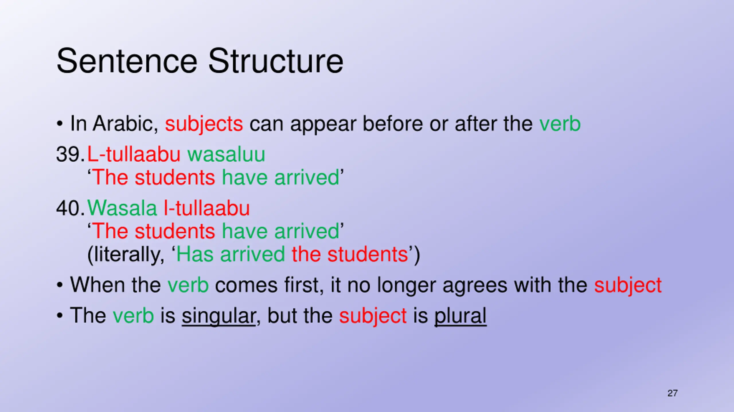 Sentence Structure In Arabic, subjects can appear before or after the verb 39.L-tullaabu wasaluu The students have arrived 40.Wasala l-tullaabu The students have arrived (literally, Has arrived the students ) When the verb comes first, it no longer agrees with the subject The verb is singular, but the subject is plural 27