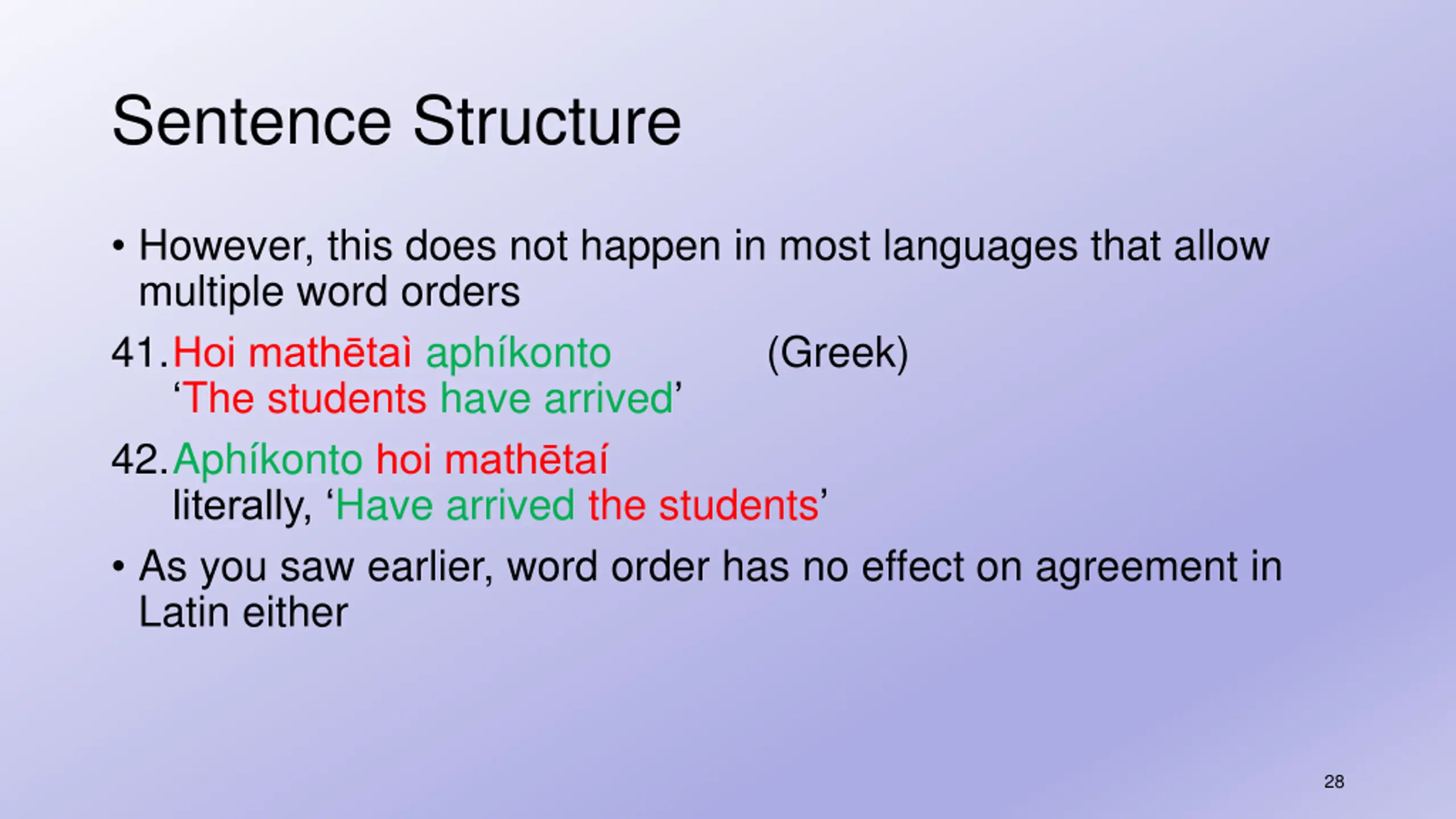 Sentence Structure However, this does not happen in most languages that allow multiple word orders 41.Hoi math ta aph konto The students have arrived 42.Aph konto hoi math ta literally, Have arrived the students As you saw earlier, word order has no effect on agreement in Latin either (Greek) 28