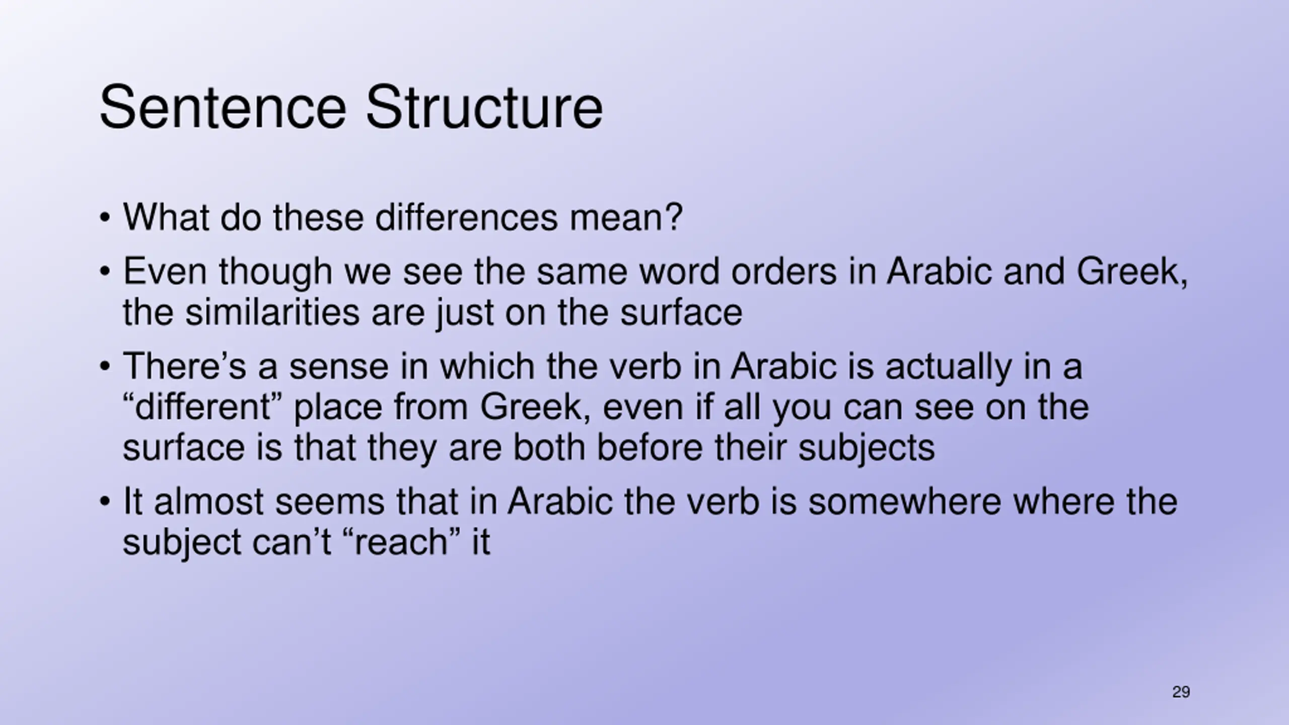 Sentence Structure What do these differences mean? Even though we see the same word orders in Arabic and Greek, the similarities are just on the surface There s a sense in which the verb in Arabic is actually in a different place from Greek, even if all you can see on the surface is that they are both before their subjects It almost seems that in Arabic the verb is somewhere where the subject can t reach it 29