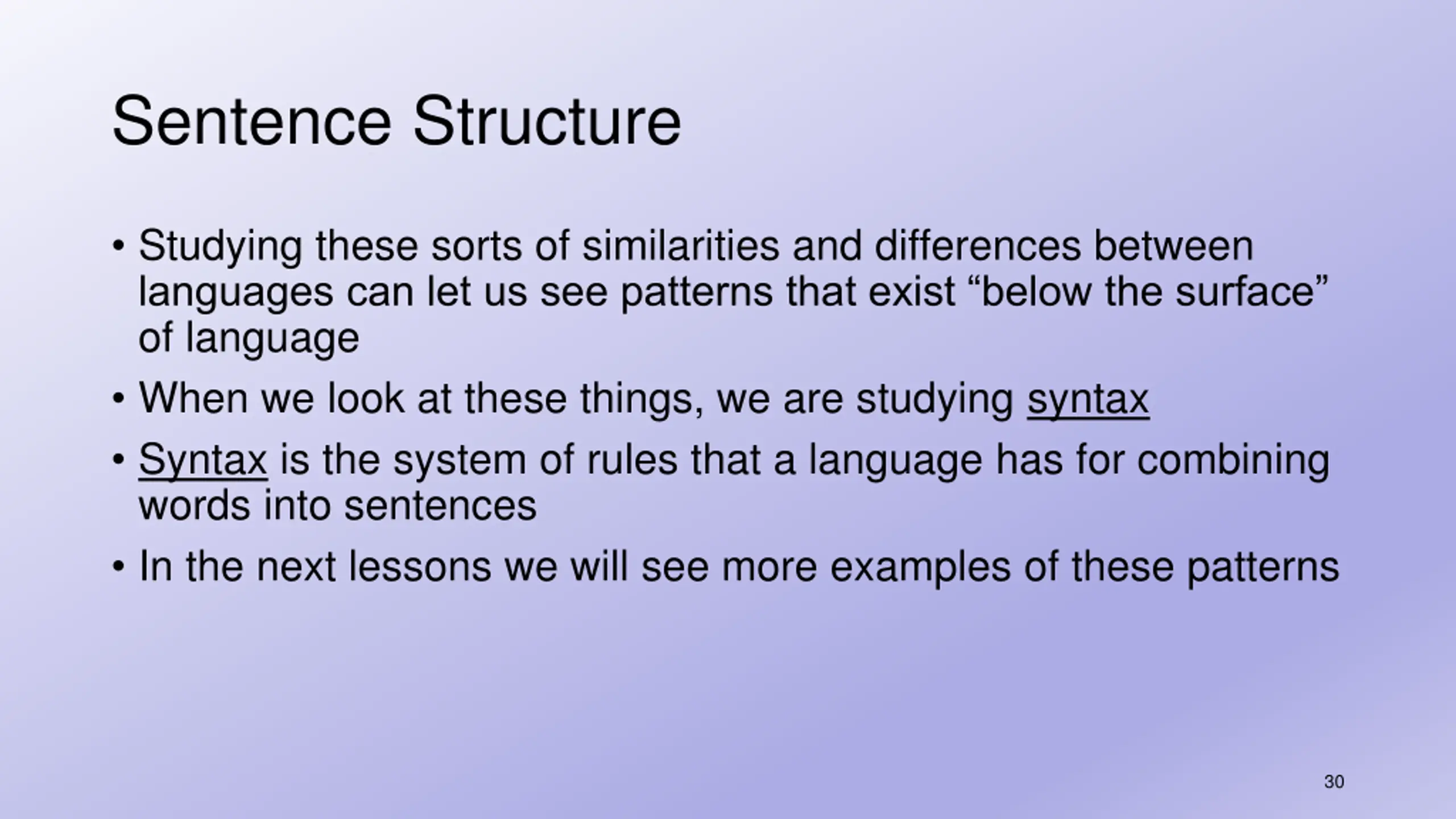 Sentence Structure Studying these sorts of similarities and differences between languages can let us see patterns that exist below the surface of language When we look at these things, we are studying syntax Syntax is the system of rules that a language has for combining words into sentences In the next lessons we will see more examples of these patterns 30