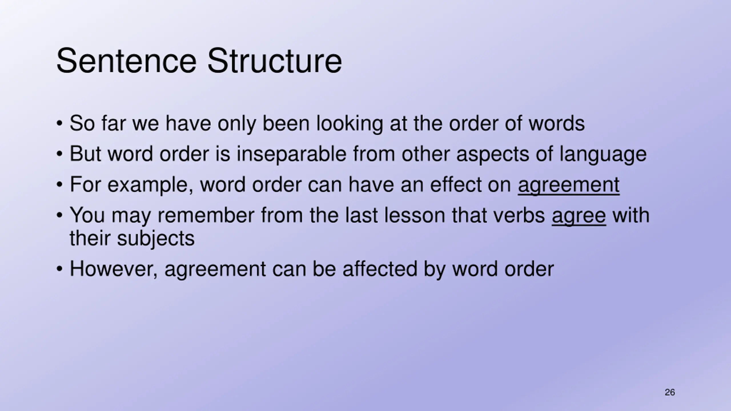 Sentence Structure So far we have only been looking at the order of words But word order is inseparable from other aspects of language For example, word order can have an effect on agreement You may remember from the last lesson that verbs agree with their subjects However, agreement can be affected by word order 26