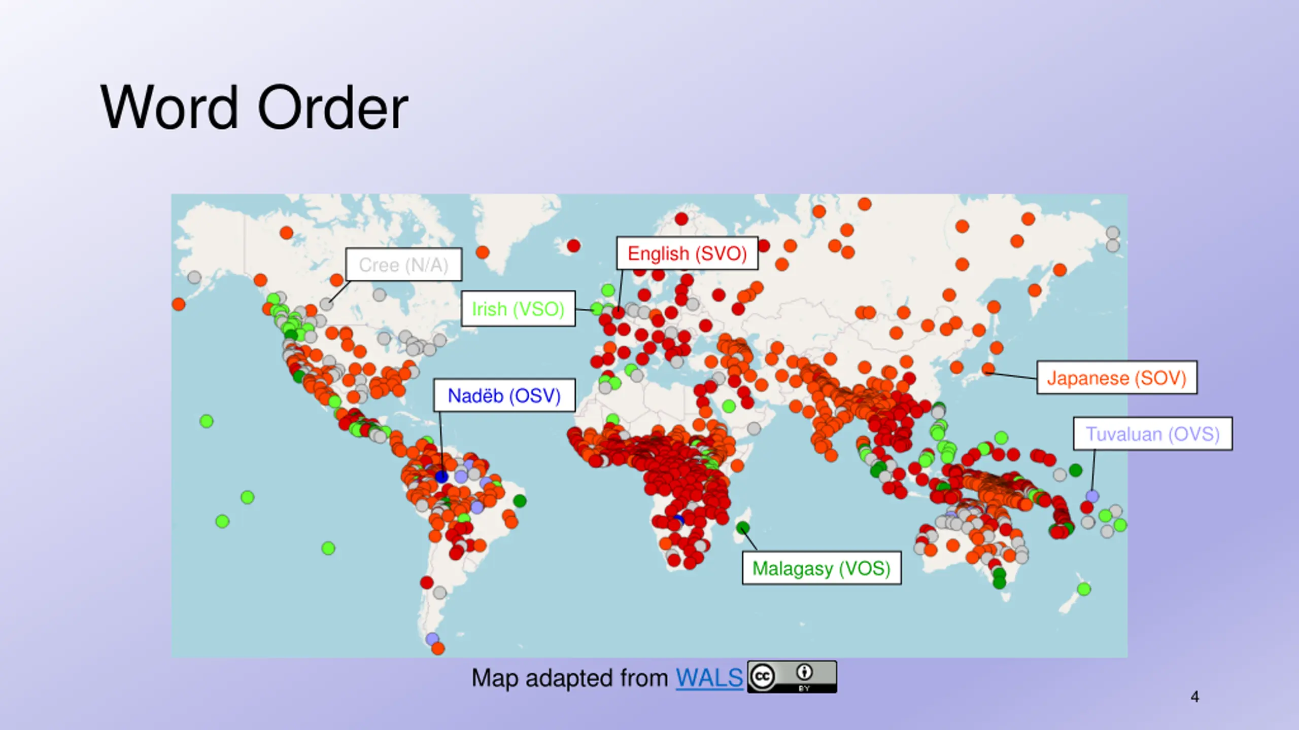Word Order English (SVO) Cree (N/A) Irish (VSO) Japanese (SOV) Nad b (OSV) Tuvaluan (OVS) Malagasy (VOS) Map adapted from WALS 4