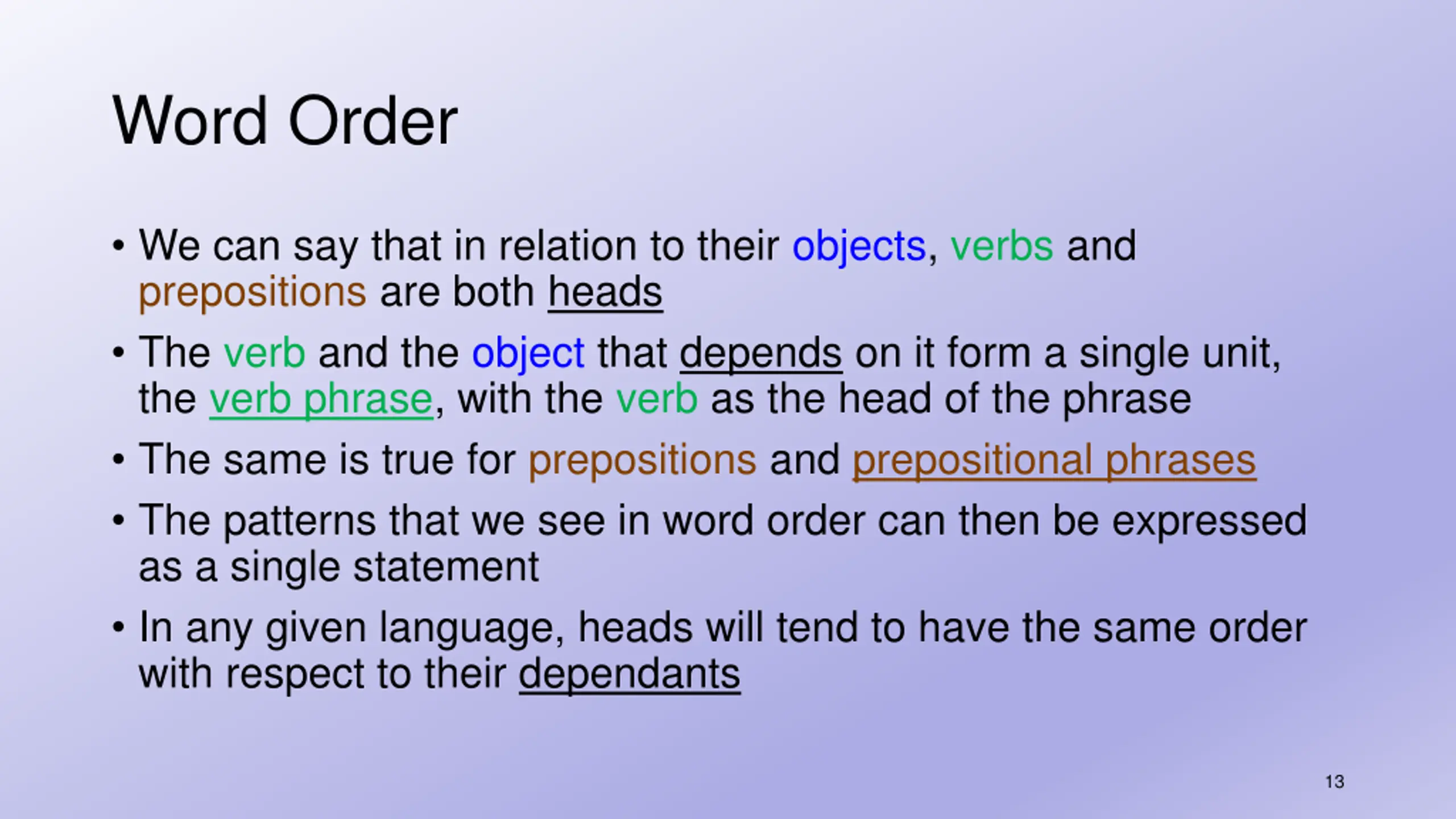 Word Order We can say that in relation to their objects, verbs and prepositions are both heads The verb and the object that depends on it form a single unit, the verb phrase, with the verb as the head of the phrase The same is true for prepositions and prepositional phrases The patterns that we see in word order can then be expressed as a single statement In any given language, heads will tend to have the same order with respect to their dependants 13