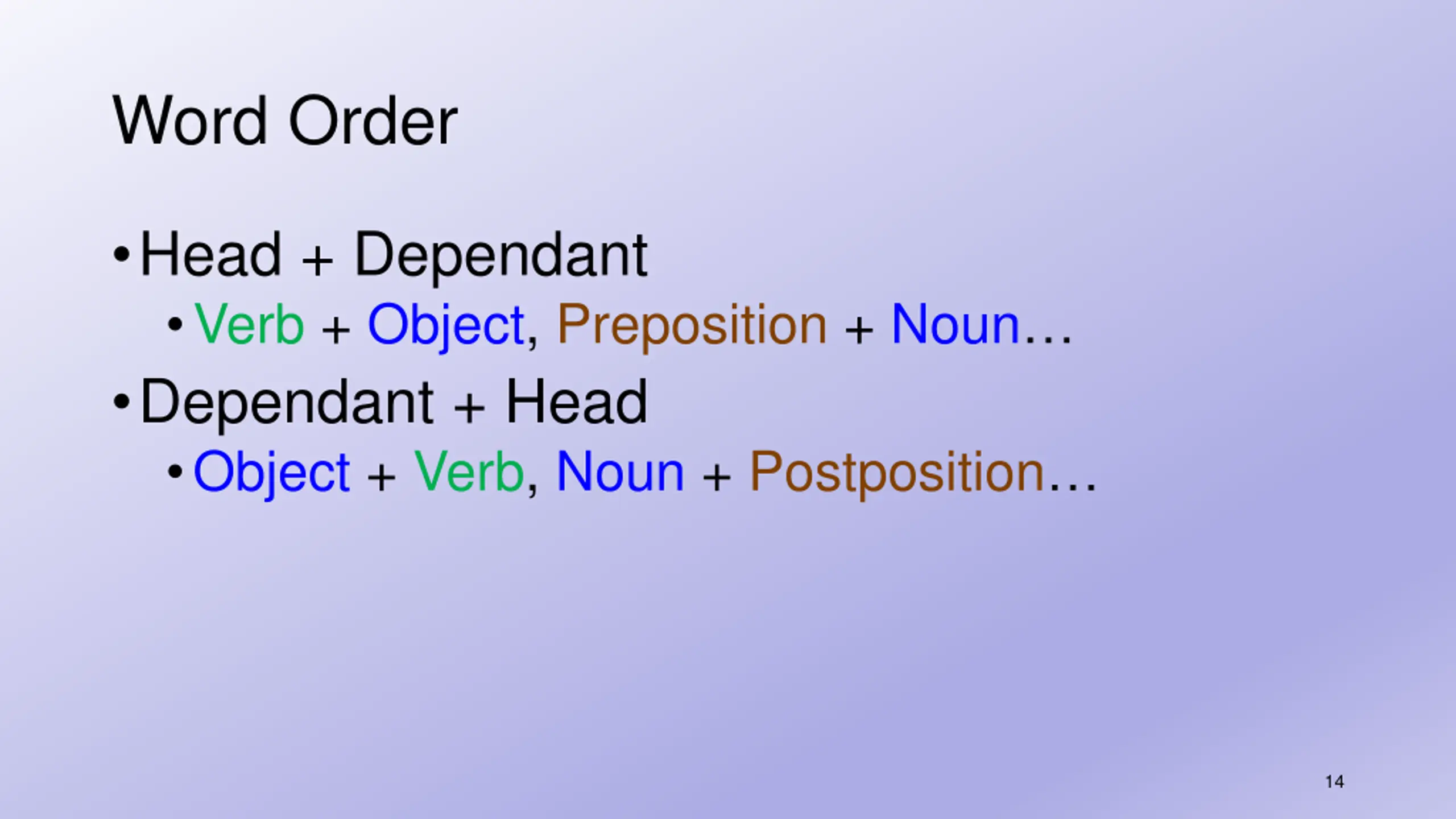 Word Order Head + Dependant Verb + Object, Preposition + Noun Dependant + Head Object + Verb, Noun + Postposition 14