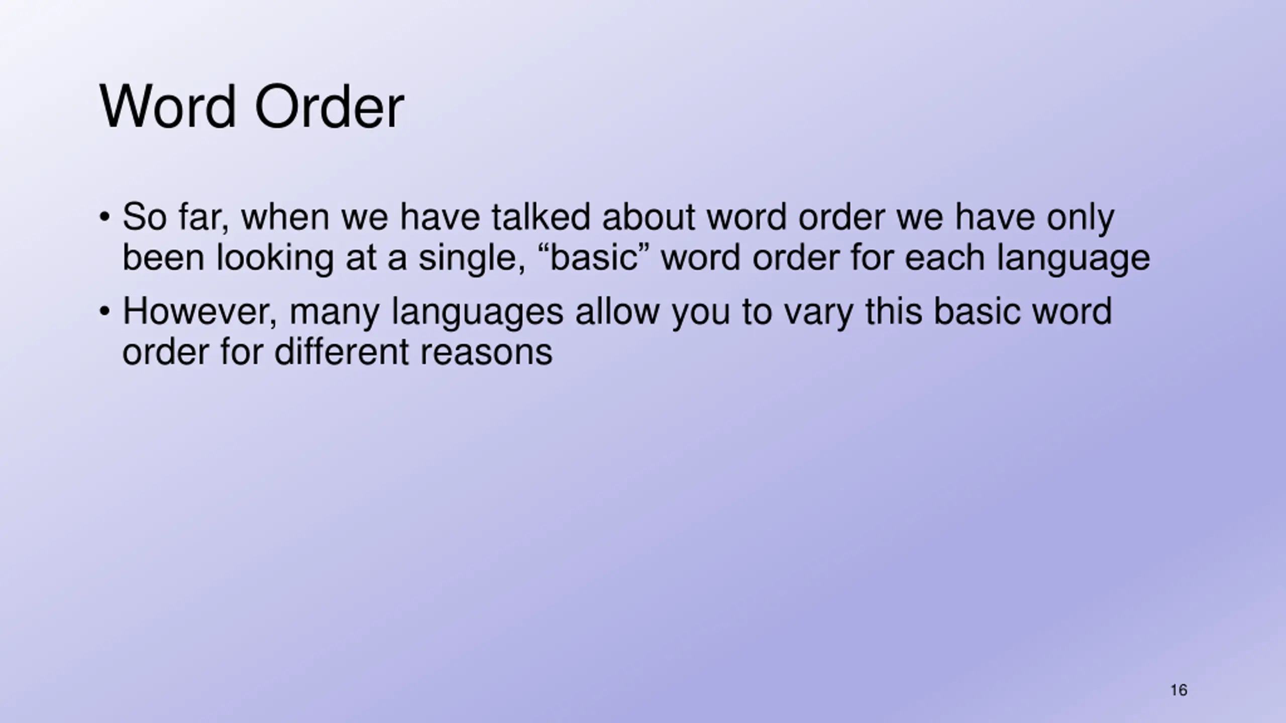 Word Order So far, when we have talked about word order we have only been looking at a single, basic word order for each language However, many languages allow you to vary this basic word order for different reasons 16
