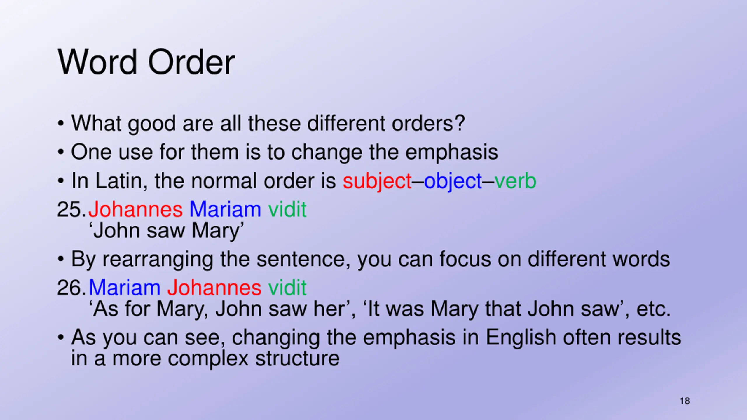 Word Order You may remember that languages in which subjects and objects are clearly marked using case endings can be very flexible about word order For example, in Latin there are six different ways of saying John saw Mary 19.Johannes Mariam vidit 20.Johannes vidit Mariam 21.Vidit Johannes Mariam 22. Vidit Mariam Johannes 23. Mariam vidit Johannes 24. Mariam Johannes vidit 17