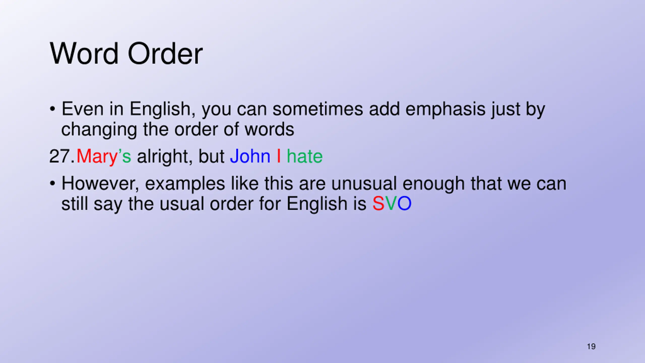 Word Order Even in English, you can sometimes add emphasis just by changing the order of words 27.Mary s alright, but John I hate However, examples like this are unusual enough that we can still say the usual order for English is SVO 19