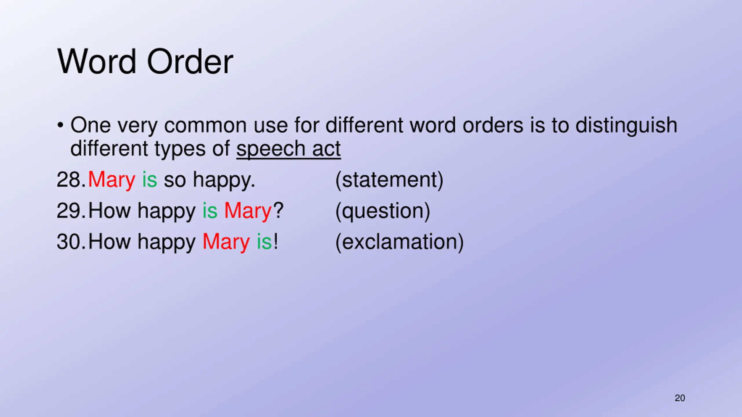 Word Order One very common use for different word orders is to distinguish different types of speech act 28.Mary is so happy. (statement) 29.How happy is Mary? (question) 30.How happy Mary is! (exclamation) 20