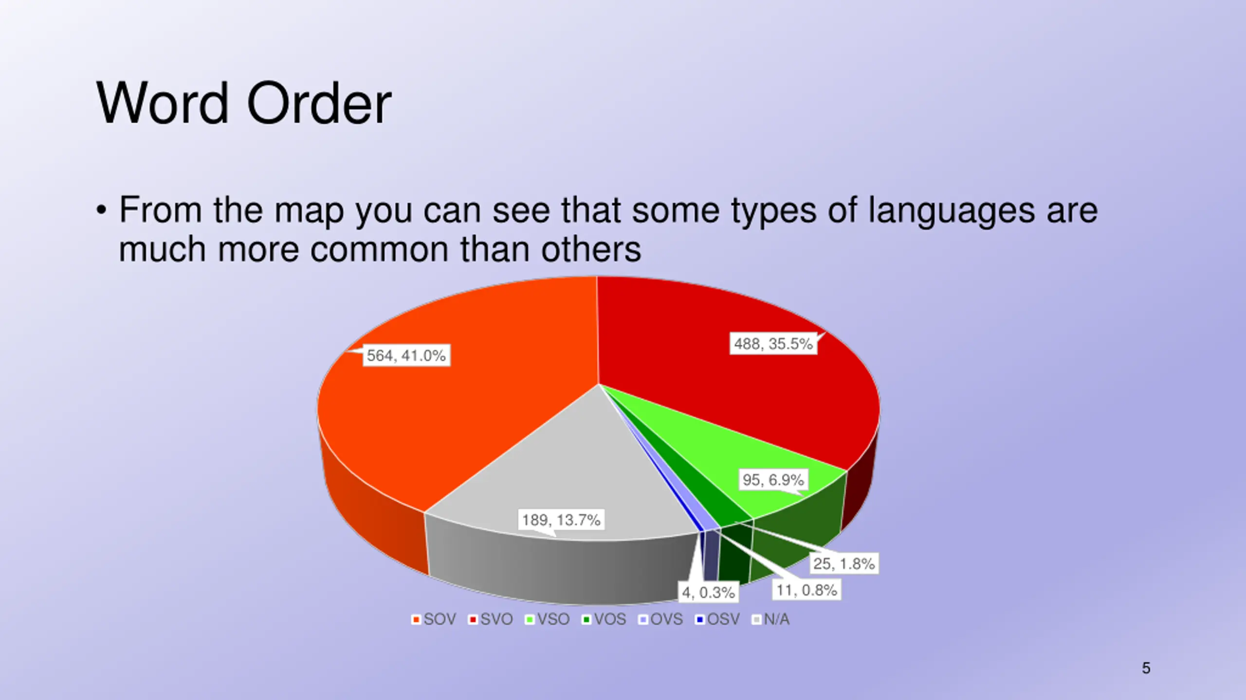 Word Order From the map you can see that some types of languages are much more common than others 488, 35.5% 564, 41.0% 95, 6.9% 189, 13.7% 25, 1.8% 11, 0.8% 4, 0.3% SOV SVO VSO VOS OVS OSV N/A 5