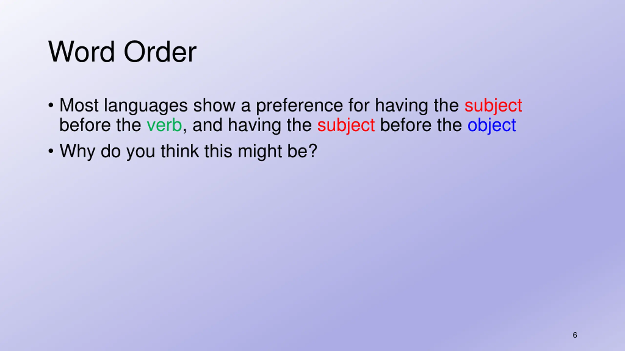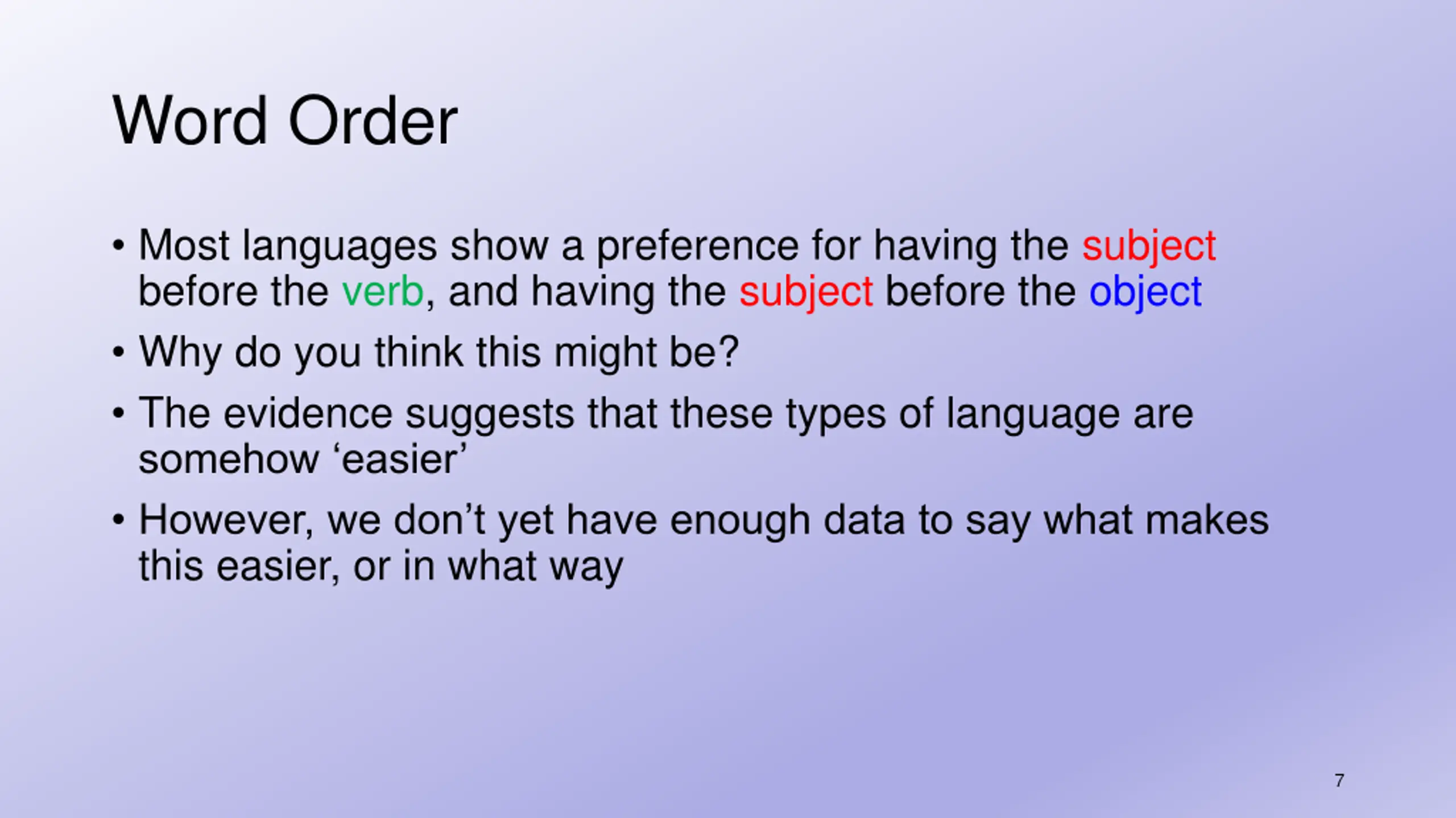 Word Order Most languages show a preference for having the subject before the verb, and having the subject before the object Why do you think this might be? 6