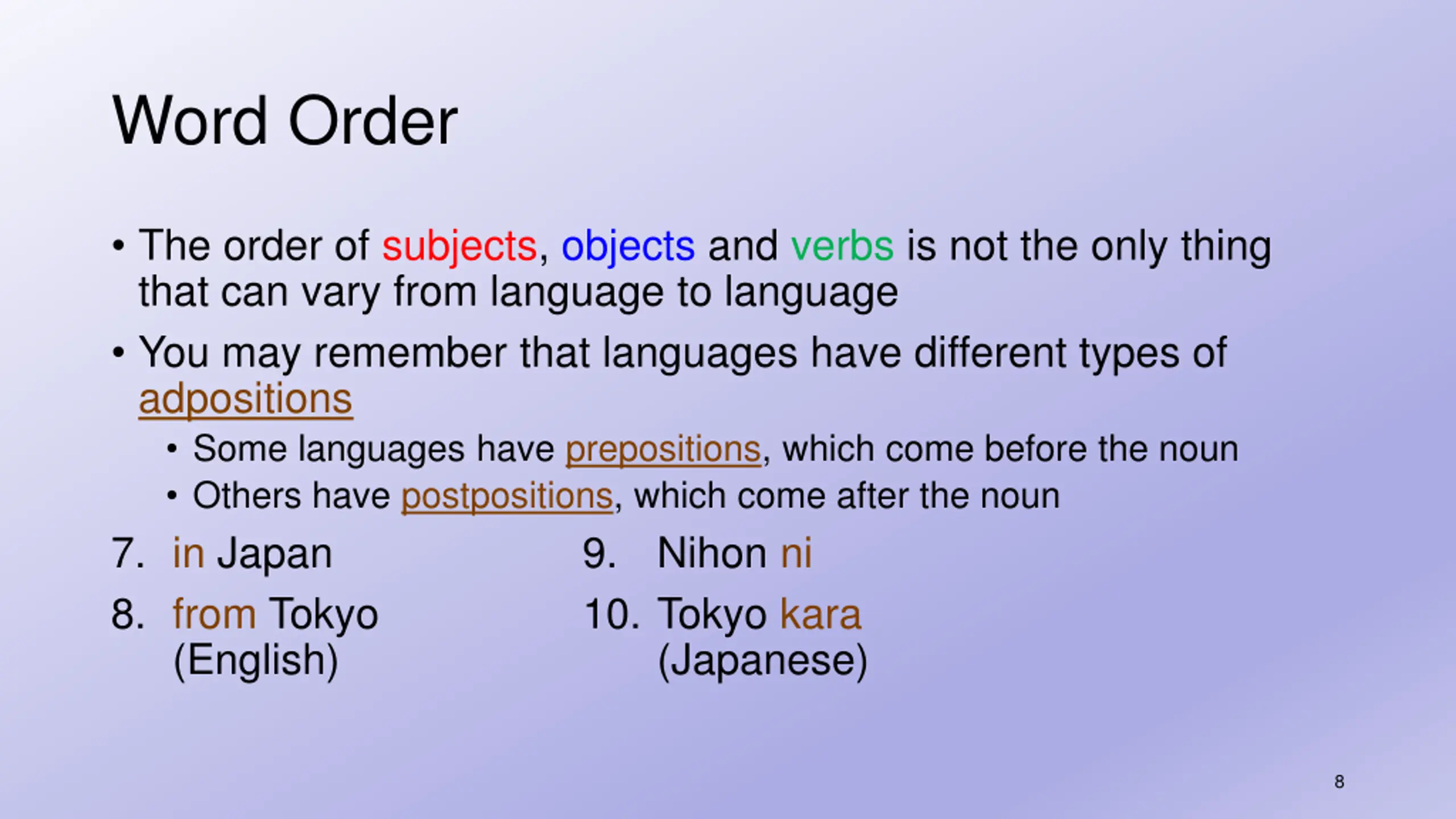 Word Order The order of subjects, objects and verbs is not the only thing that can vary from language to language You may remember that languages have different types of adpositions Some languages have prepositions, which come before the noun Others have postpositions, which come after the noun 7. in Japan 9. Nihon ni 8. from Tokyo 10. Tokyo kara (English) (Japanese) 8