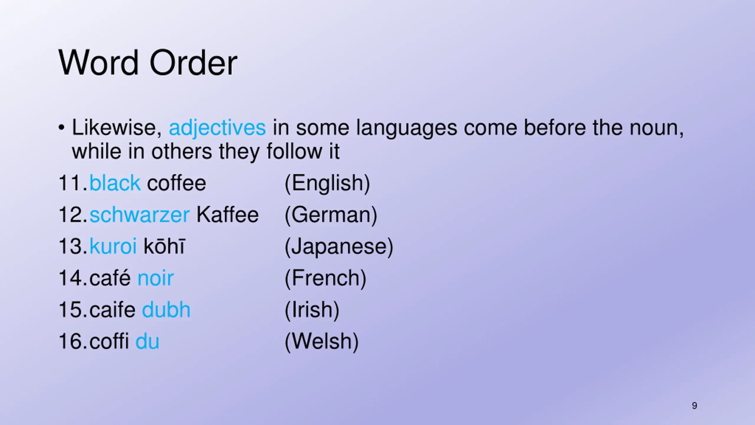 Word Order Likewise, adjectives in some languages come before the noun, while in others they follow it 11.black coffee (English) 12.schwarzer Kaffee (German) 13.kuroi k h (Japanese) 14.caf noir (French) 15.caife dubh (Irish) 16.coffi du (Welsh) 9