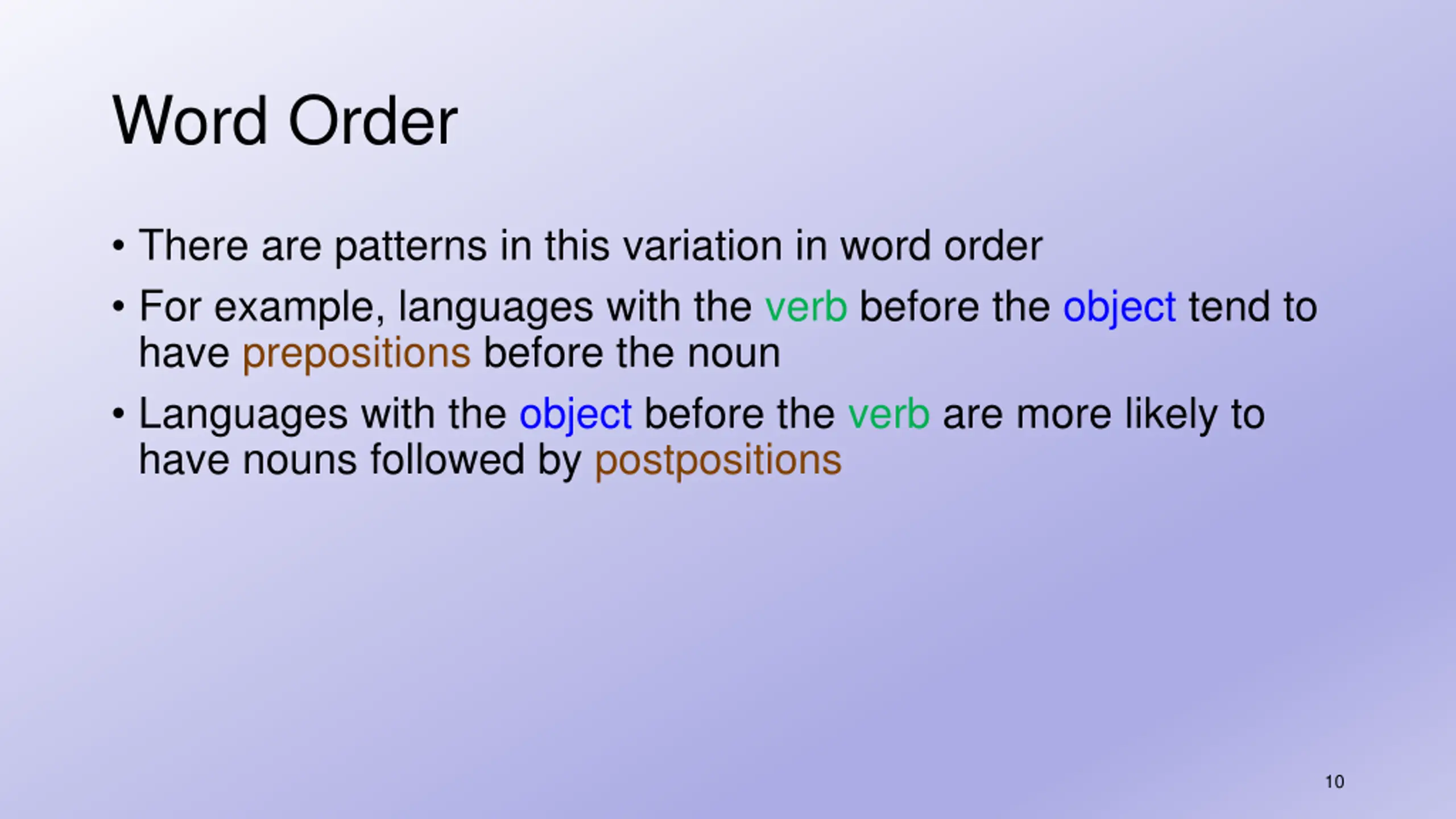 Word Order There are patterns in this variation in word order For example, languages with the verb before the object tend to have prepositions before the noun Languages with the object before the verb are more likely to have nouns followed by postpositions 10