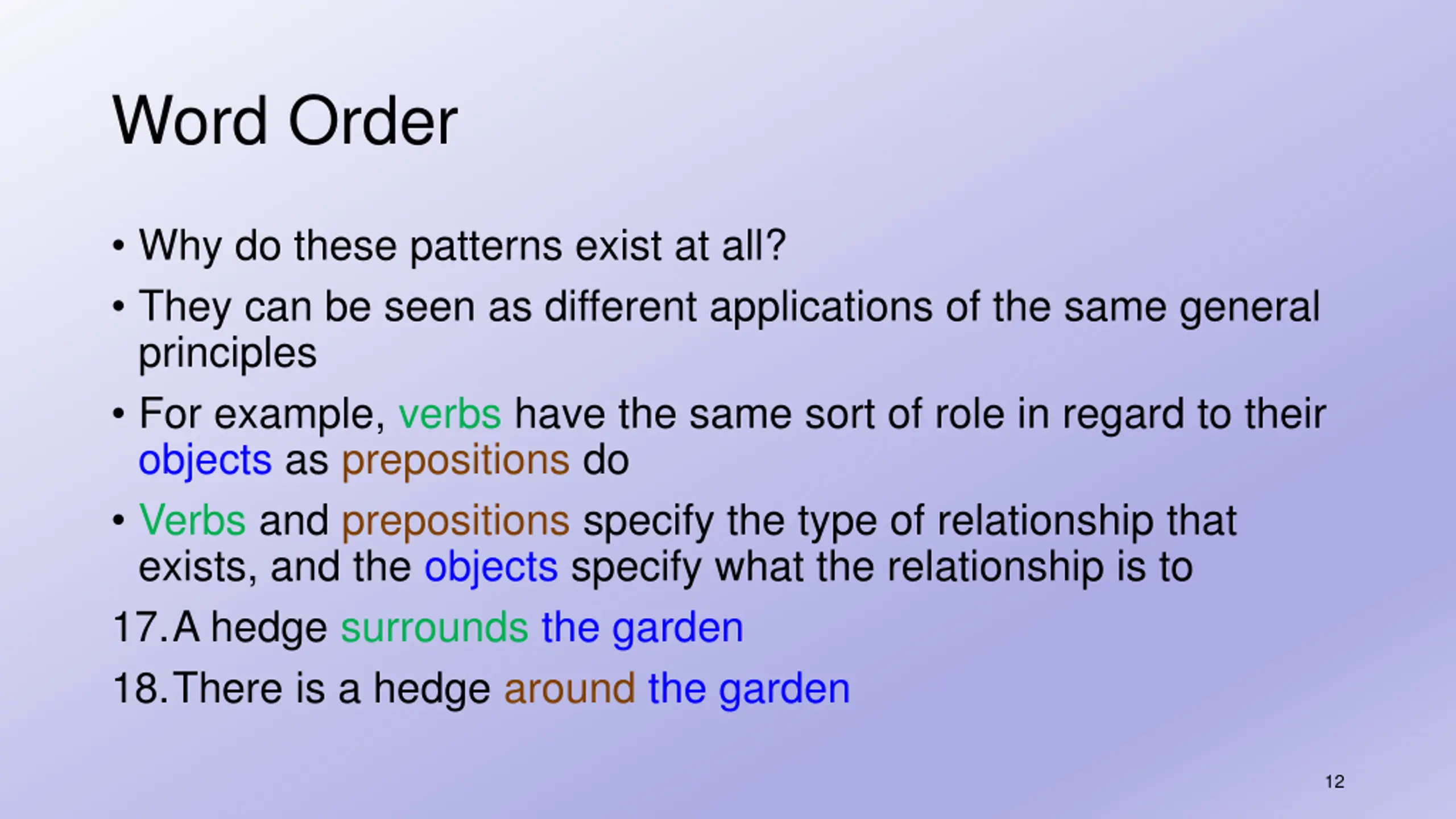 Word Order Why do these patterns exist at all? They can be seen as different applications of the same general principles For example, verbs have the same sort of role in regard to their objects as prepositions do Verbs and prepositions specify the type of relationship that exists, and the objects specify what the relationship is to 17.A hedge surrounds the garden 18.There is a hedge around the garden 12