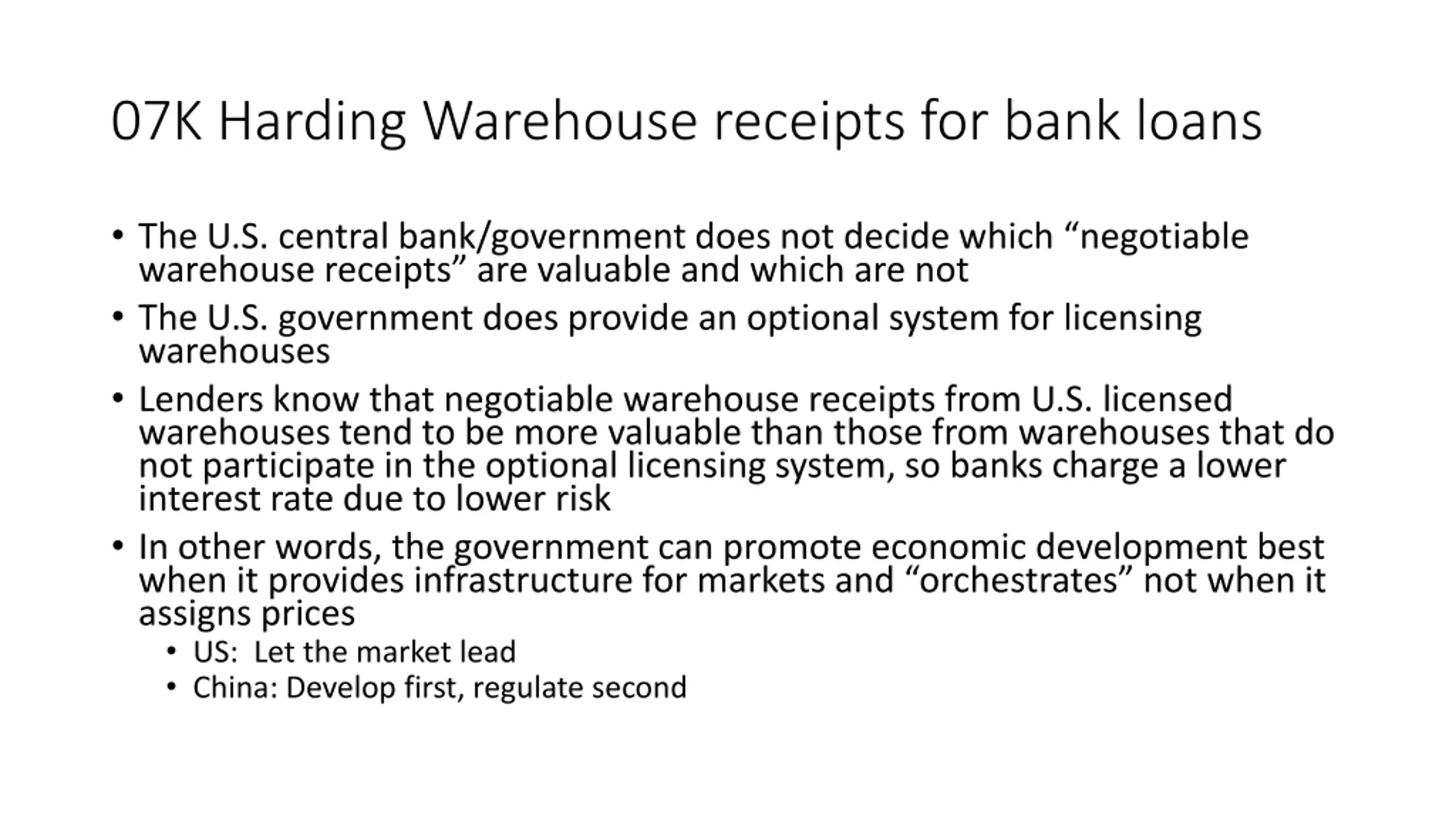 07K Harding Warehouse receipts for bank loans The U.S. central bank/government does not decide which negotiable warehouse receipts are valuable and which are not The U.S. government does provide an optional system for licensing warehouses Lenders know that negotiable warehouse receipts from U.S. licensed warehouses tend to be more valuable than those from warehouses that do not participate in the optional licensing system, so banks charge a lower interest rate due to lower risk In other words, the government can promote economic development best when it provides infrastructure for markets and orchestrates not when it assigns prices US: Let the market lead China: Develop first, regulate second