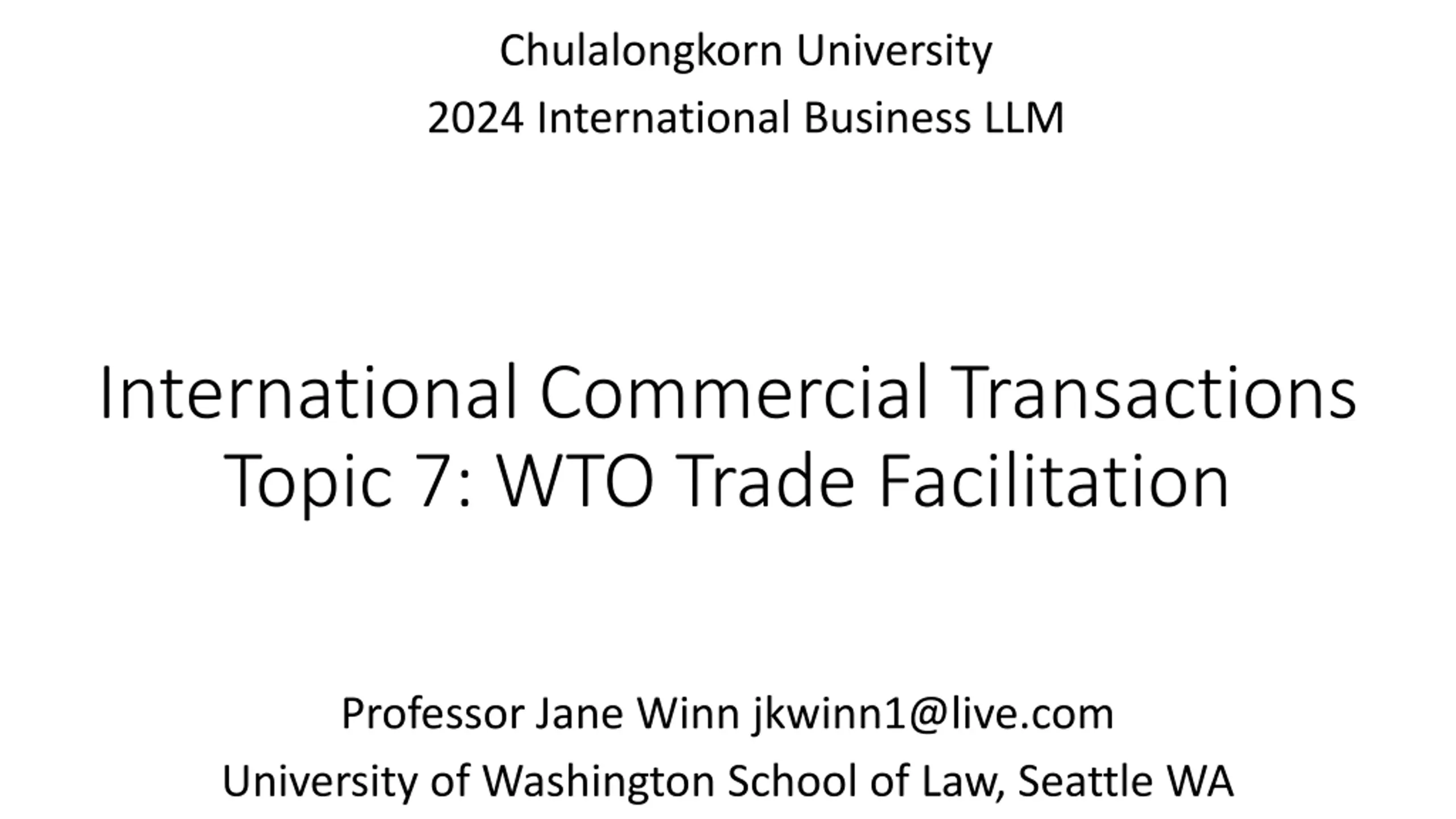 Chulalongkorn University 2024 International Business LLM International Commercial Transactions Topic 7: WTO Trade Facilitation Professor Jane Winn jkwinn1@live.com University of Washington School of Law, Seattle WA
