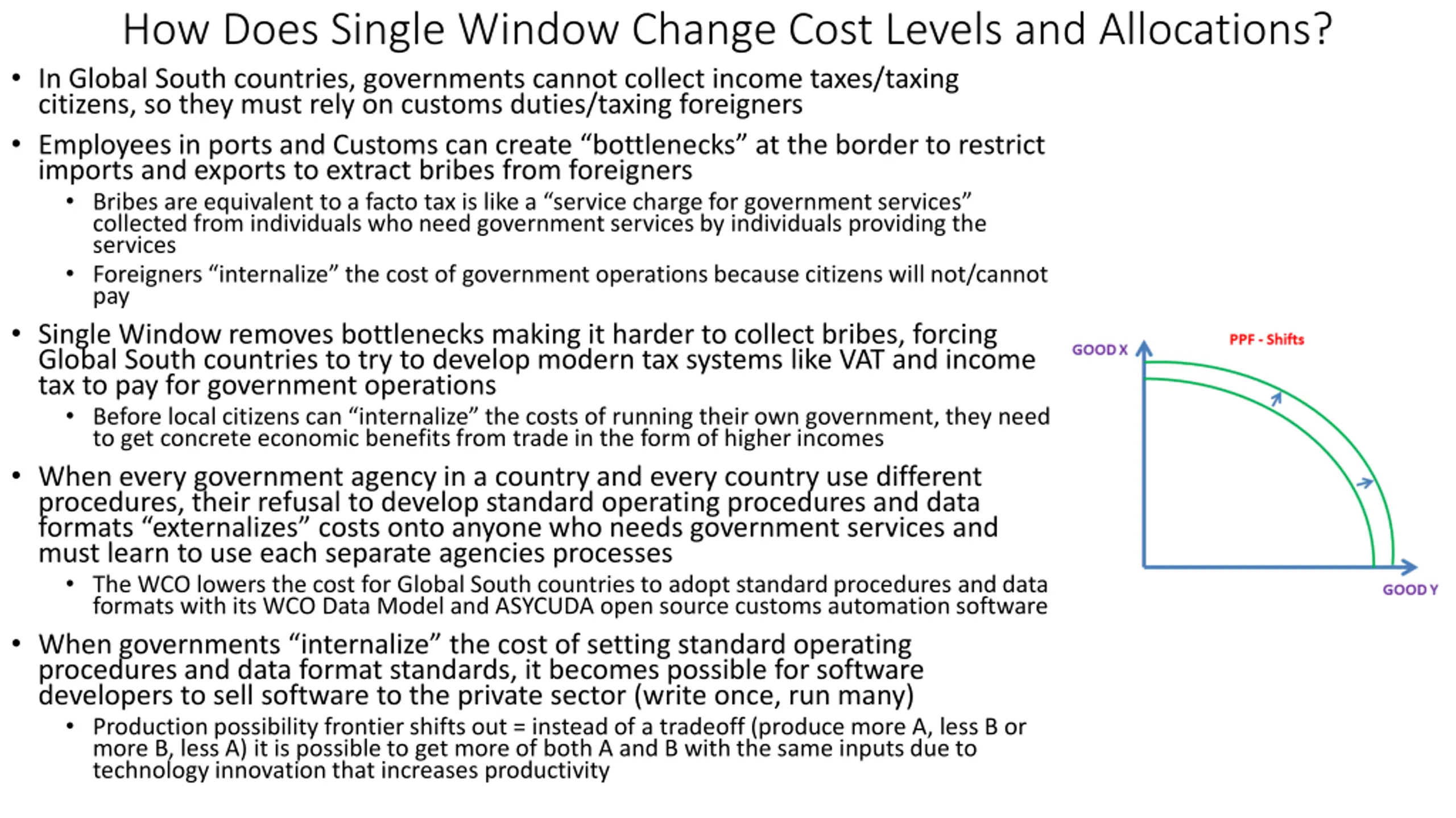 How Does Single Window Change Cost Levels and Allocations? In Global South countries, governments cannot collect income taxes/taxing citizens, so they must rely on customs duties/taxing foreigners Employees in ports and Customs can create bottlenecks at the border to restrict imports and exports to extract bribes from foreigners Bribes are equivalent to a facto tax is like a service charge for government services collected from individuals who need government services by individuals providing the services Foreigners internalize the cost of government operations because citizens will not/cannot pay Single Window removes bottlenecks making it harder to collect bribes, forcing Global South countries to try to develop modern tax systems like VAT and income tax to pay for government operations Before local citizens can internalize the costs of running their own government, they need to get concrete economic benefits from trade in the form of higher incomes When every government agency in a country and every country use different procedures, their refusal to develop standard operating procedures and data formats externalizes costs onto anyone who needs government services and must learn to use each separate agencies processes The WCO lowers the cost for Global South countries to adopt standard procedures and data formats with its WCO Data Model and ASYCUDA open source customs automation software When governments internalize the cost of setting standard operating procedures and data format standards, it becomes possible for software developers to sell software to the private sector (write once, run many) Production possibility frontier shifts out = instead of a tradeoff (produce more A, less B or more B, less A) it is possible to get more of both A and B with the same inputs due to technology innovation that increases productivity