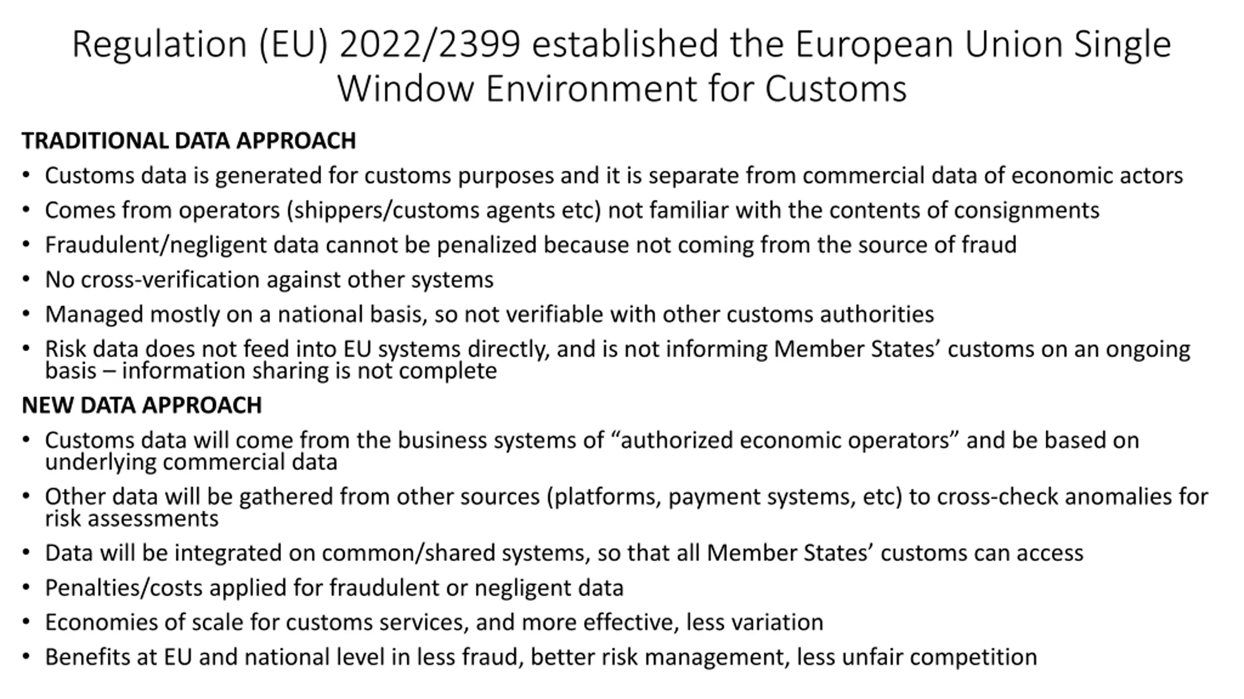Regulation (EU) 2022/2399 established the European Union Single Window Environment for Customs TRADITIONAL DATA APPROACH Customs data is generated for customs purposes and it is separate from commercial data of economic actors Comes from operators (shippers/customs agents etc) not familiar with the contents of consignments Fraudulent/negligent data cannot be penalized because not coming from the source of fraud No cross-verification against other systems Managed mostly on a national basis, so not verifiable with other customs authorities Risk data does not feed into EU systems directly, and is not informing Member States customs on an ongoing basis information sharing is not complete NEW DATA APPROACH Customs data will come from the business systems of authorized economic operators and be based on underlying commercial data Other data will be gathered from other sources (platforms, payment systems, etc) to cross-check anomalies for risk assessments Data will be integrated on common/shared systems, so that all Member States customs can access Penalties/costs applied for fraudulent or negligent data Economies of scale for customs services, and more effective, less variation Benefits at EU and national level in less fraud, better risk management, less unfair competition