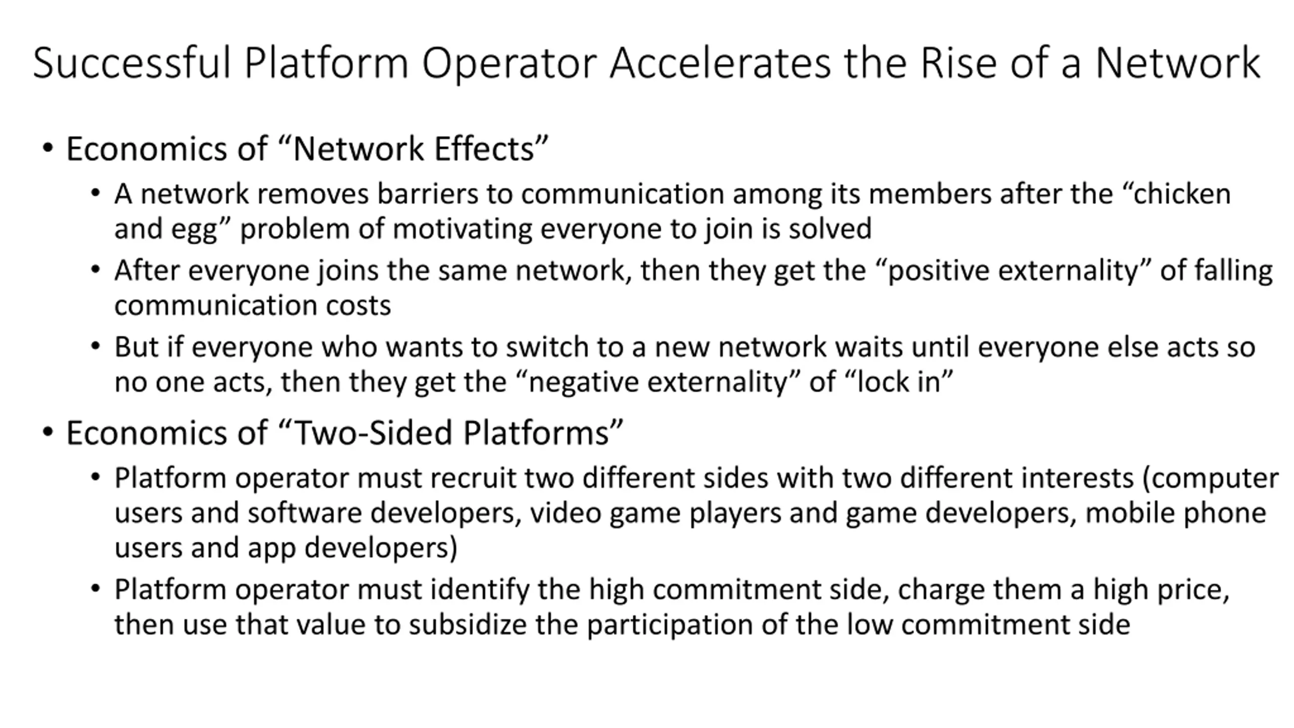 Successful Platform Operator Accelerates the Rise of a Network Economics of Network Effects A network removes barriers to communication among its members after the chicken and egg problem of motivating everyone to join is solved After everyone joins the same network, then they get the positive externality of falling communication costs But if everyone who wants to switch to a new network waits until everyone else acts so no one acts, then they get the negative externality of lock in Economics of Two-Sided Platforms Platform operator must recruit two different sides with two different interests (computer users and software developers, video game players and game developers, mobile phone users and app developers) Platform operator must identify the high commitment side, charge them a high price, then use that value to subsidize the participation of the low commitment side
