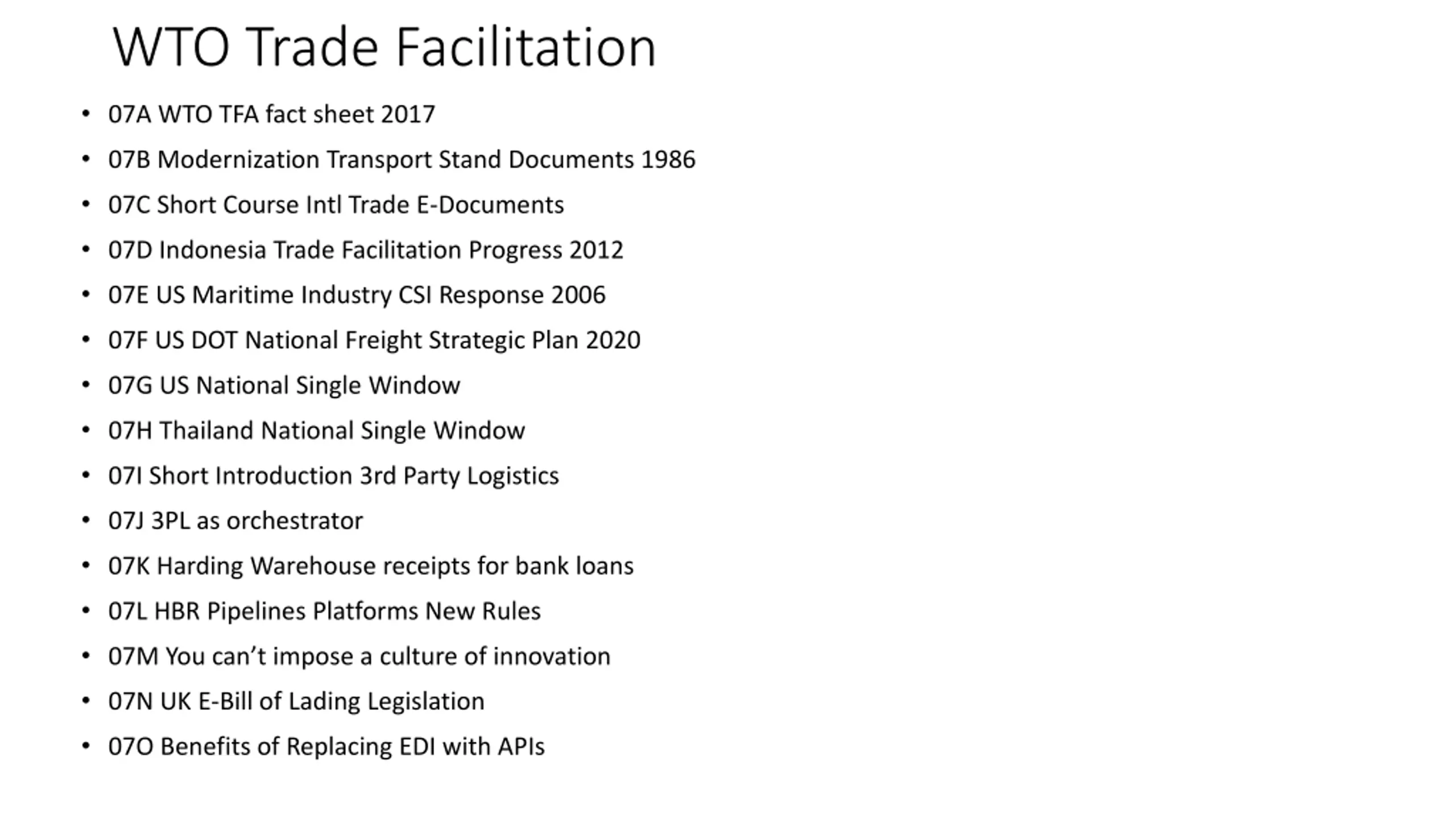 WTO Trade Facilitation 07A WTO TFA fact sheet 2017 07B Modernization Transport Stand Documents 1986 07C Short Course Intl Trade E-Documents 07D Indonesia Trade Facilitation Progress 2012 07E US Maritime Industry CSI Response 2006 07F US DOT National Freight Strategic Plan 2020 07G US National Single Window 07H Thailand National Single Window 07I Short Introduction 3rd Party Logistics 07J 3PL as orchestrator 07K Harding Warehouse receipts for bank loans 07L HBR Pipelines Platforms New Rules 07M You can t impose a culture of innovation 07N UK E-Bill of Lading Legislation 07O Benefits of Replacing EDI with APIs