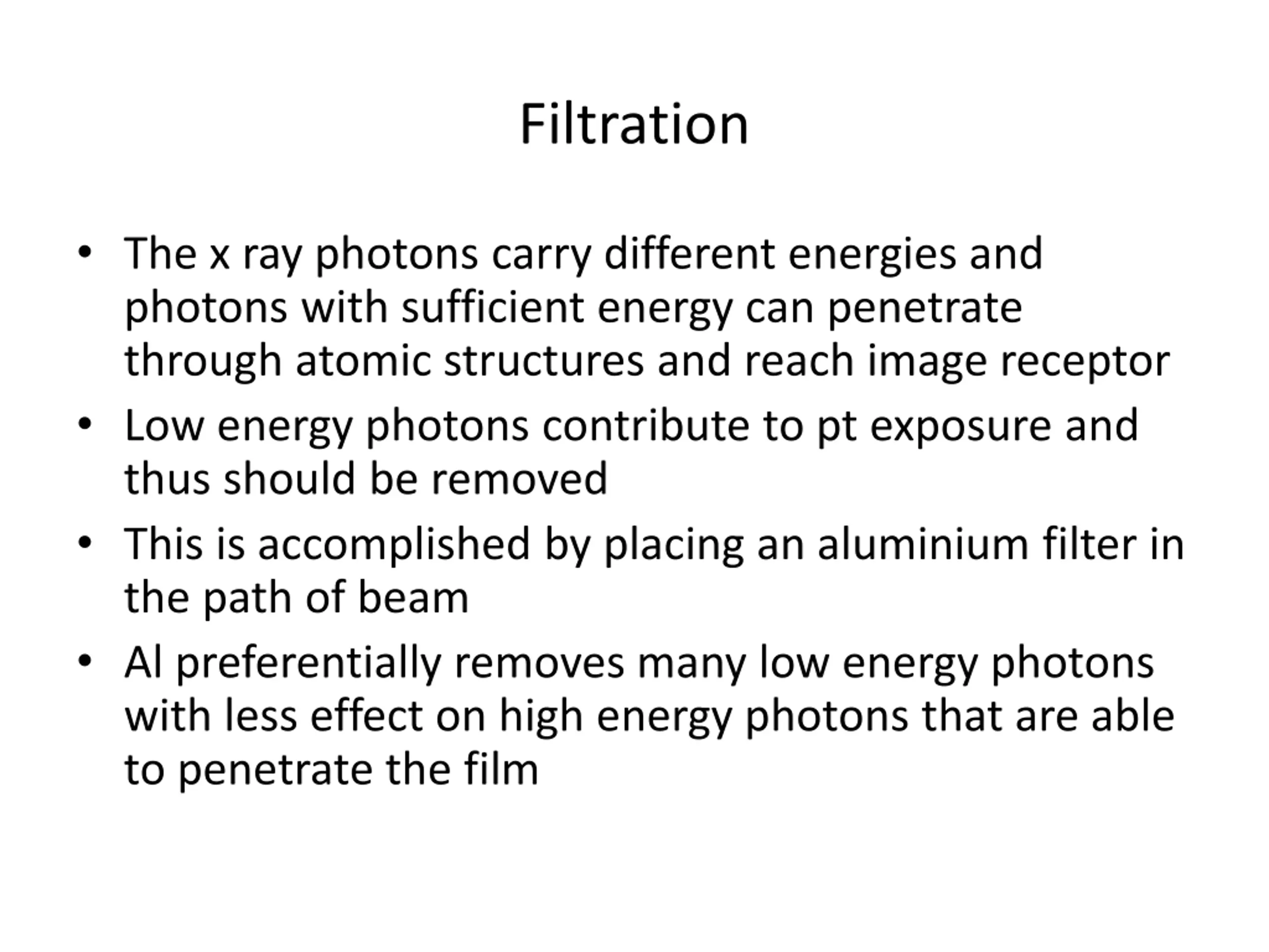 Filtration The x ray photons carry different energies and photons with sufficient energy can penetrate through atomic structures and reach image receptor Low energy photons contribute to pt exposure and thus should be removed This is accomplished by placing an aluminium filter in the path of beam Al preferentially removes many low energy photons with less effect on high energy photons that are able to penetrate the film