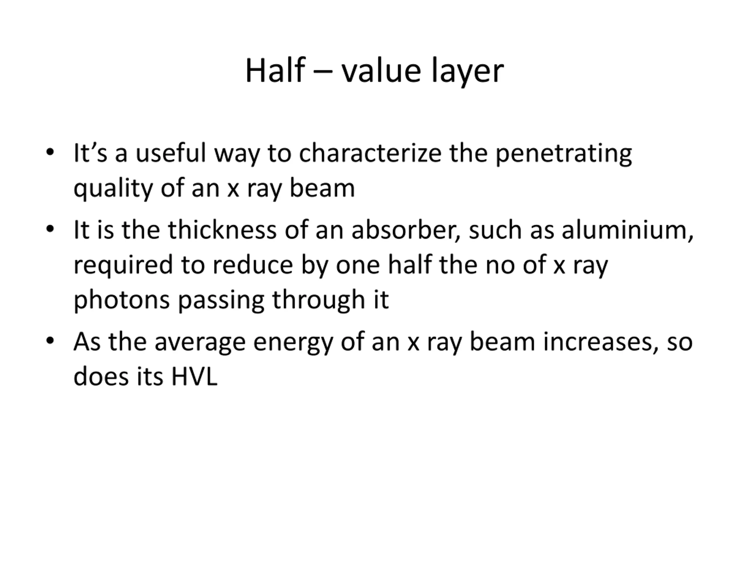 Half value layer It s a useful way to characterize the penetrating quality of an x ray beam It is the thickness of an absorber, such as aluminium, required to reduce by one half the no of x ray photons passing through it As the average energy of an x ray beam increases, so does its HVL