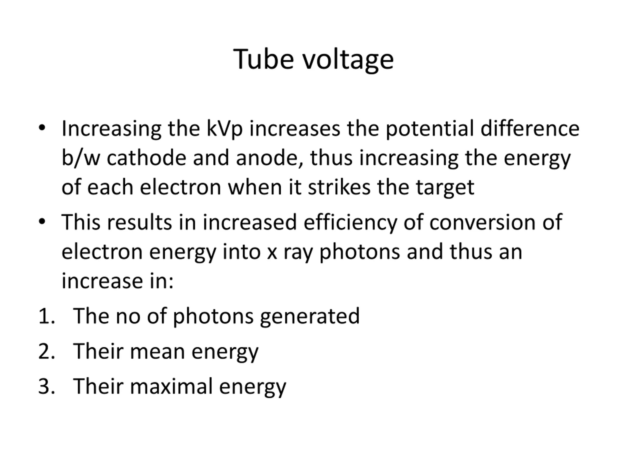 Tube voltage Increasing the kVp increases the potential difference b/w cathode and anode, thus increasing the energy of each electron when it strikes the target This results in increased efficiency of conversion of electron energy into x ray photons and thus an increase in: 1. The no of photons generated 2. Their mean energy 3. Their maximal energy