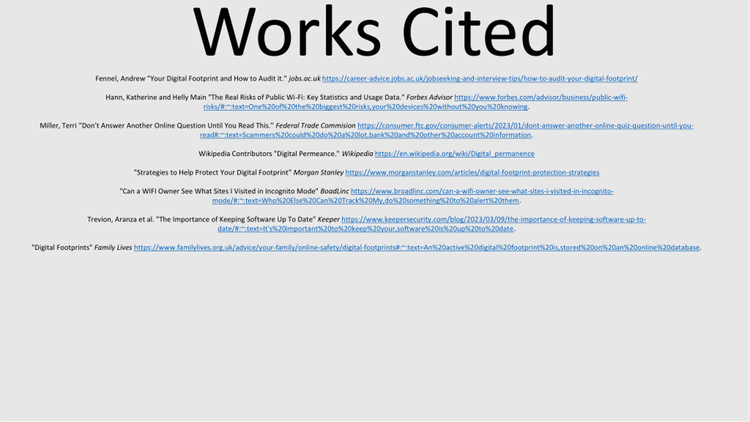 Fennel, Andrew "Your Digital Footprint and How to Audit it." jobs.ac.uk https://career-advice.jobs.ac.uk/jobseeking-and-interview-tips/how-to-audit-your-digital-footprint/ Works Cited Hann, Katherine and Helly Main "The Real Risks of Public Wi-Fi: Key Statistics and Usage Data." Forbes Advisor https://www.forbes.com/advisor/business/public-wifi- risks/#:~:text=One%20of%20the%20biggest%20risks,your%20devices%20without%20you%20knowing. Miller, Terri "Don't Answer Another Online Question Until You Read This." Federal Trade Commision https://consumer.ftc.gov/consumer-alerts/2023/01/dont-answer-another-online-quiz-question-until-you- read#:~:text=Scammers%20could%20do%20a%20lot,bank%20and%20other%20account%20information. Wikipedia Contributors "Digital Permeance." Wikipediahttps://en.wikipedia.org/wiki/Digital_permanence "Strategies to Help Protect Your Digital Footprint" Morgan Stanley https://www.morganstanley.com/articles/digital-footprint-protection-strategies "Can a WIFI Owner See What Sites I Visited in Incognito Mode" BoadLinc https://www.broadlinc.com/can-a-wifi-owner-see-what-sites-i-visited-in-incognito- mode/#:~:text=Who%20Else%20Can%20Track%20My,do%20something%20to%20alert%20them. Trevion, Aranza et al. "The Importance of Keeping Software Up To Date" Keeper https://www.keepersecurity.com/blog/2023/03/09/the-importance-of-keeping-software-up-to- date/#:~:text=It's%20important%20to%20keep%20your,software%20is%20up%20to%20date. "Digital Footprints" Family Lives https://www.familylives.org.uk/advice/your-family/online-safety/digital-footprints#:~:text=An%20active%20digital%20footprint%20is,stored%20on%20an%20online%20database.